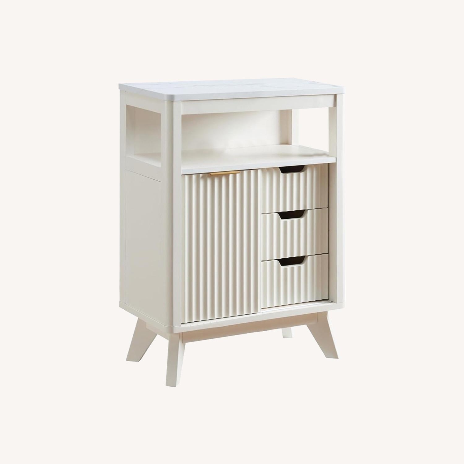 The unique waveform fluted panel not only enhances texture but also elevates spatial presence, creating an exceptional piece for your space. The faux marble top, adorned with grey-toned veins, perfectly complements the cream oak finish. The smooth curved edge adds an extra touch of elegance, while the wide metal handle contributes to its contemporary allure.