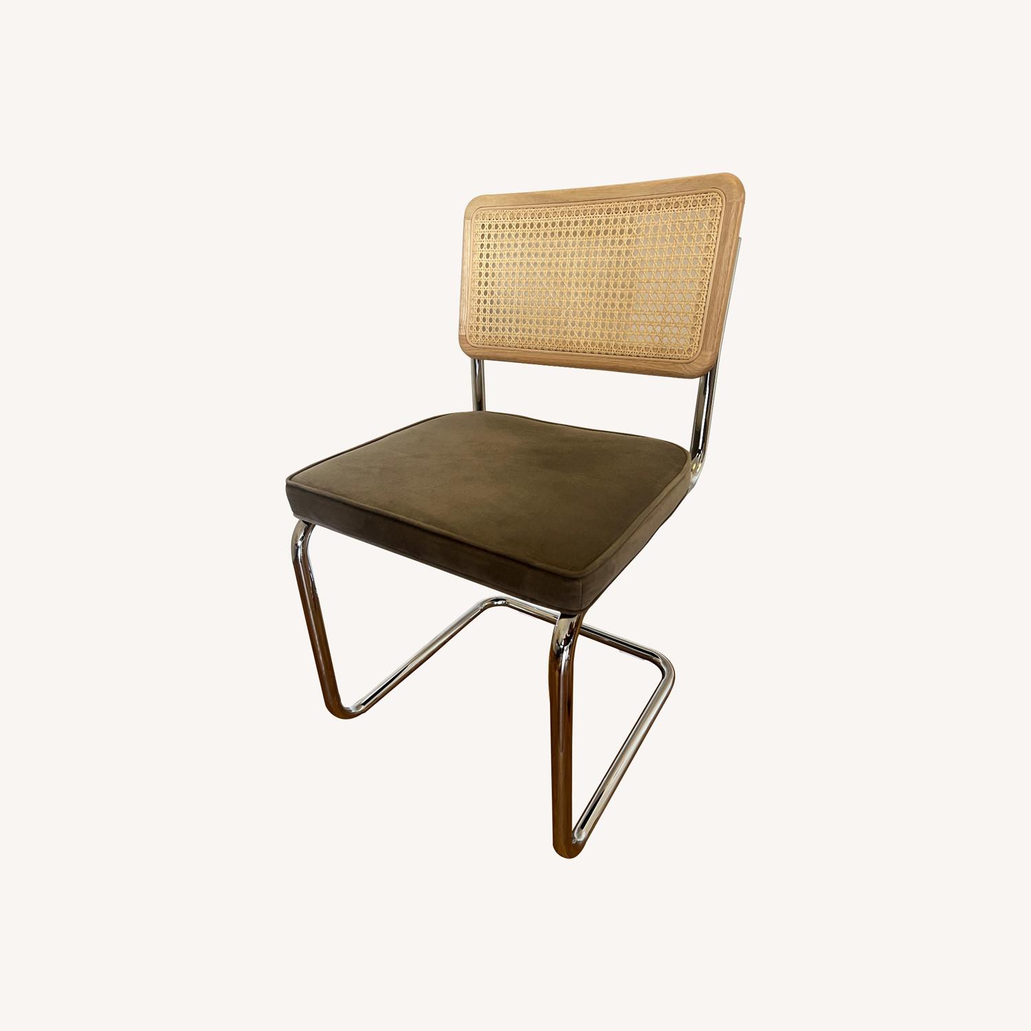 This 2-piece set of side chairs draws on a bold Bauhaus-inspired aesthetic for your dining area. Each one features cantilever-style construction with a tubular, chrome-finished steel frame and a backrest of solid wood + woven cane for lots of contrast. Luxe velvet softens the seat, while foam padding provides welcome support.