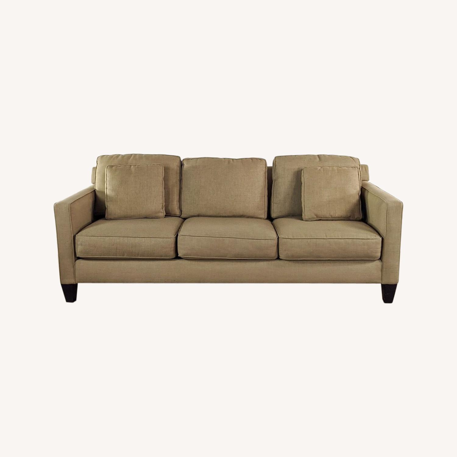 Seller's Notes:Contemporary, Custom Made Sofa Upholstered In Camel "Linen Look" Fabric With Track Arms And Dark Finish Legs.. Brand: Bauhaus. Model: . #SKU: 1042581