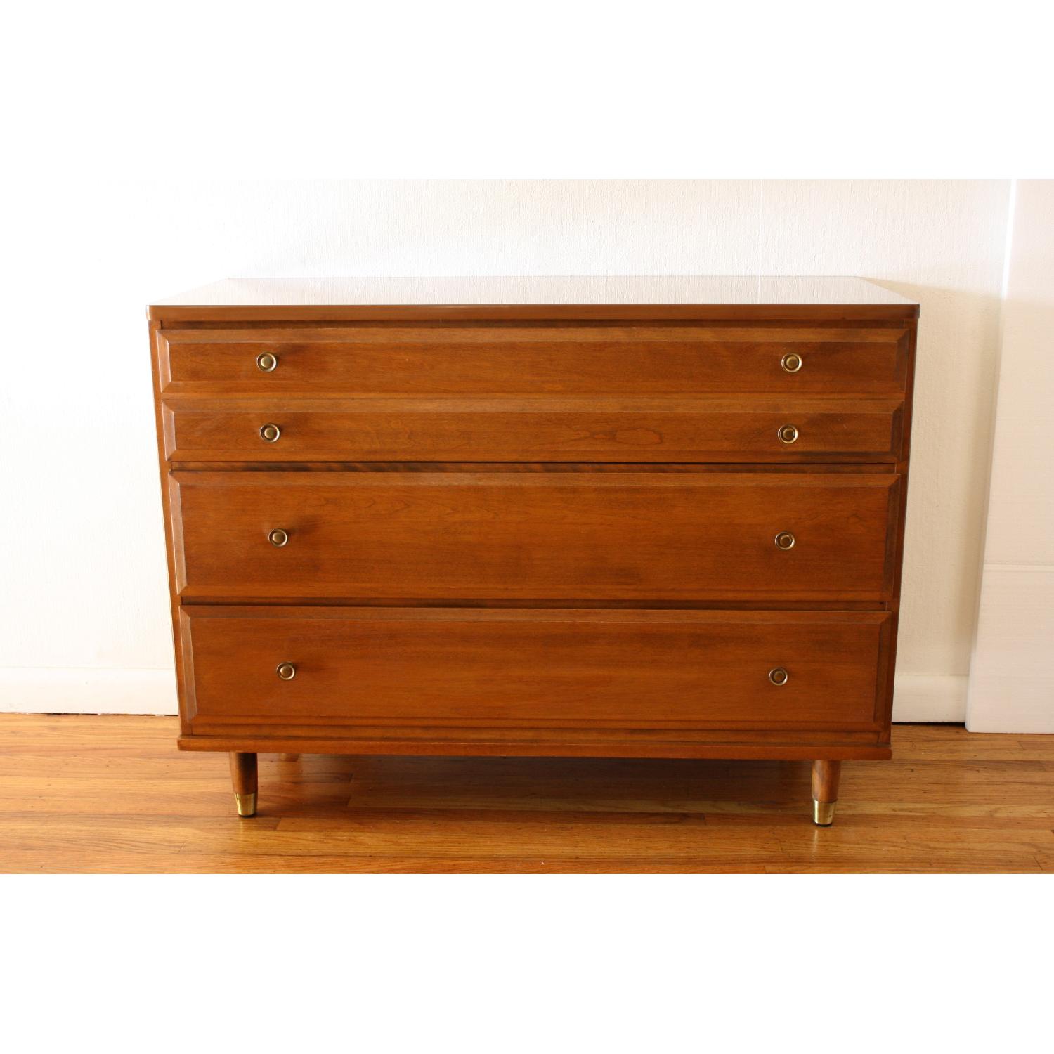 Seller's Notes:Mid century modern bachelor chest dresser by Baumritter, with handsome brass knobs, and brass tipped tapered legs...bought in January/Feb for $1K (after taxes and deliv fee) and am redoing my apartment! It is very heavy. I want it out asap. tired of it.