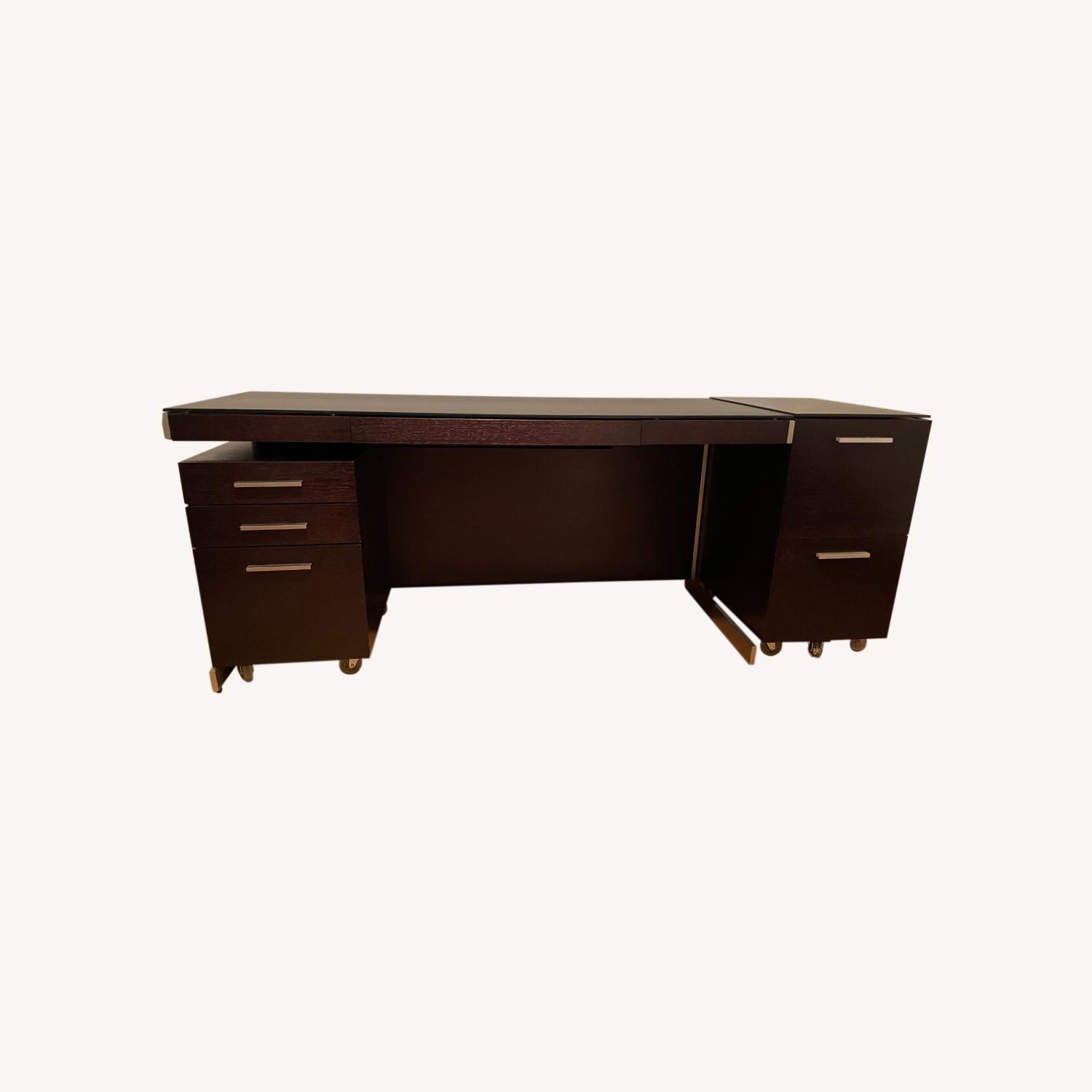 Seller's Notes:Sleek & highly-functional BDI desk set in Charcoal Stained Ash/Satin Nickel. Fashionable and durable as hell. They think of everything for hook-ups to PC & Electronic equipment, including cord cut-outs and removable back (to the desk) and each piece is highly functional. The Mobile File Pedestals are meant to fit under the desk (left side) and add and extension/dimension to (right side), but can each stand in the room separately. Both are easily mobile with wheels and have a mix of narrow & deep file drawers as you can see from the pictures. This desk set was barely used, other than for drawer storage, as it sat in a spare apartment for 4 years. These units, new, are priced at $2,800 for the set. If you can find them. Please click the link to see more of the features of the units. The dimensions of the small file cabinet (under left side of desk) are H: 24"; W: 15.25"; D: 21.125". The dimensions of the larger file (right extension of desk) are H: 28.625"; W: 15.125"; 23.375". When the larger file cabinet is attached to the right side of the desk (as in the phot), the combined width is W: 74.875". SOLD ONLY AS A SET.