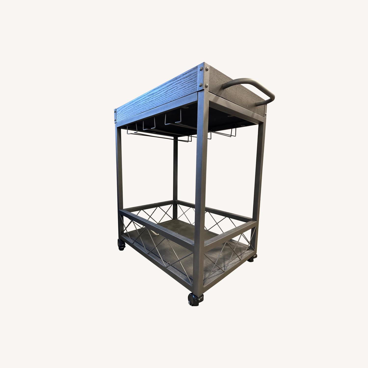 Seller's Notes:Virtually brand new heavy duty industrial bar cart! No damage! Was utilized as a statement piece. Received as a gift with missing hardware.. specifically missing the screws to attach the top to the posts of the cart, super easy fix that we never got around too since it was a statement piece! (see photos) Has 4 wheels, hanging racks for wine glasses and both top and lower storage!!