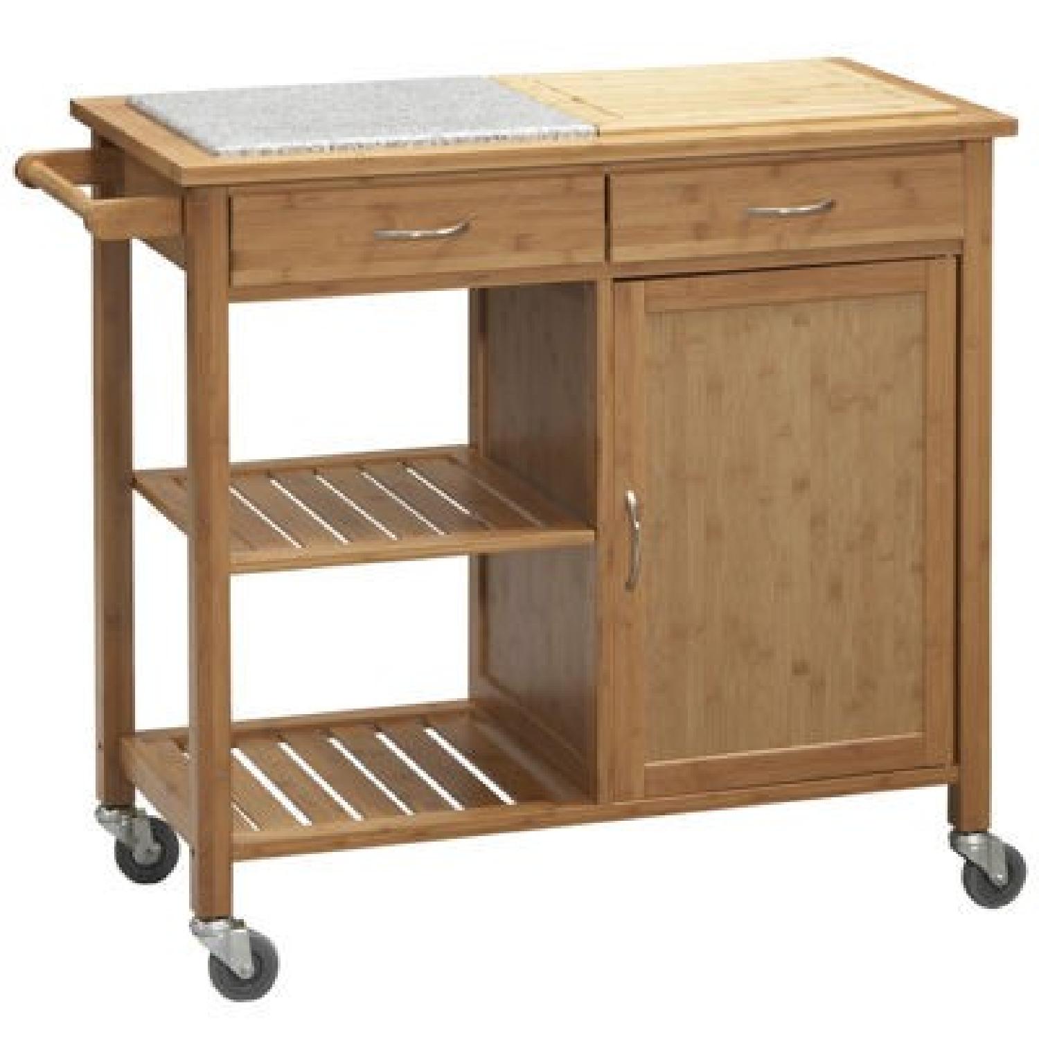 Seller's Notes:This kitchen rolling cart is VERY functional and attractive. It is a great addition to a small kitchen for added counter space and storage. Although this cart is used, it is in very good working condition. The removable wood chopping board has been used most but everything is in working order. The locking wheels roll easily when necessary. Both the granite and wood cutting boards are removable for easy cleaning. There are two drawers, 2 open shelves and two closed shelves. There is also a side towel bar.