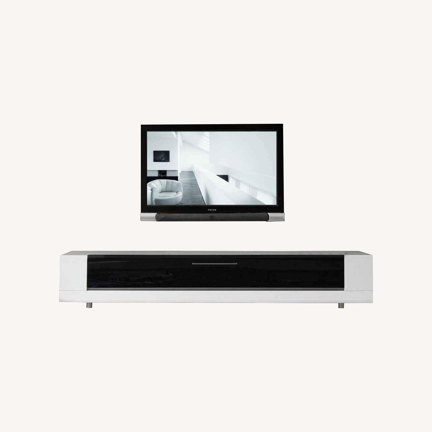 Seller's Notes:Features: - Infrared-compatible black glass flip-down door with soft-closing hinges - 3 component spaces hidden behind black glass - Soft-closing technology on flip-down door - Ventilated rear panel - Side storage shelving - Tempered glass front - Stainless steel legs with anti-scratch base - Crafted with functionality in mind, features a seamlessly integrated cabling system for a clean and organized look. The sturdy construction includes metal bolt reinforcements for added durability. - Measuring 14 inches high by 78.75 inches wide by 18.75 inches deep, this TV stand has inside component shelves of 20.5 inches wide by 17 inches deep by 7.5 inches high. From smoke free pet free and child free home.