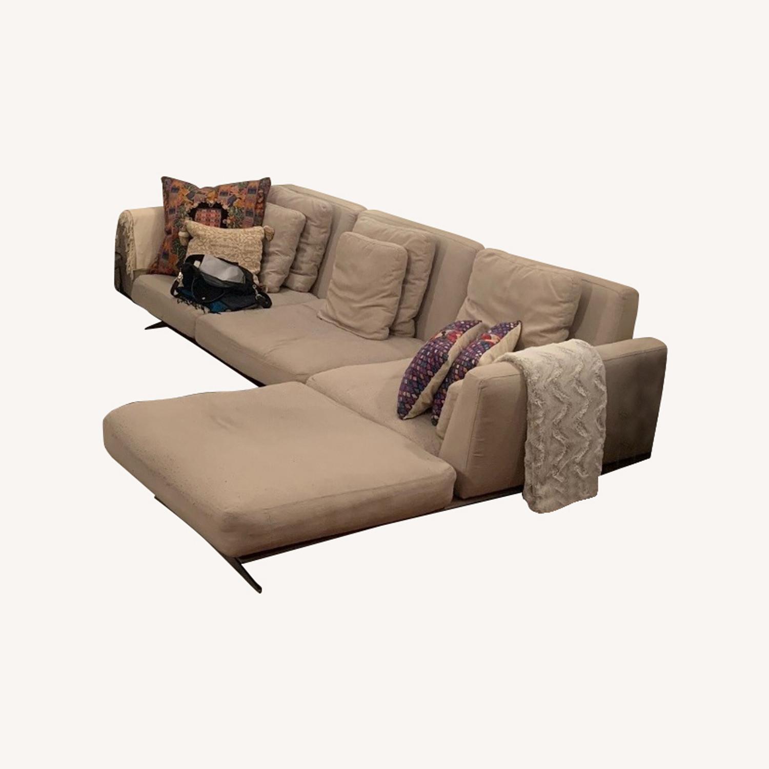 Seller's Notes:This beige linin fabric mid-century sectional sofa was bought in a designer furniture shop in Colombia in 2018. It has been in a clean, no-pet, no-smoke home ever since in NYC. It is in very good condition, but the cushions could use a revitalization with memory foam or similar material. The cushions all have zipper access to allow for this and for cleaning. The colorful pillows are my own but the beige loose ones come along with the sofa. It is in two pieces. The main part of the sofa is 39 inches deep, with the chaise 72 inches deep.