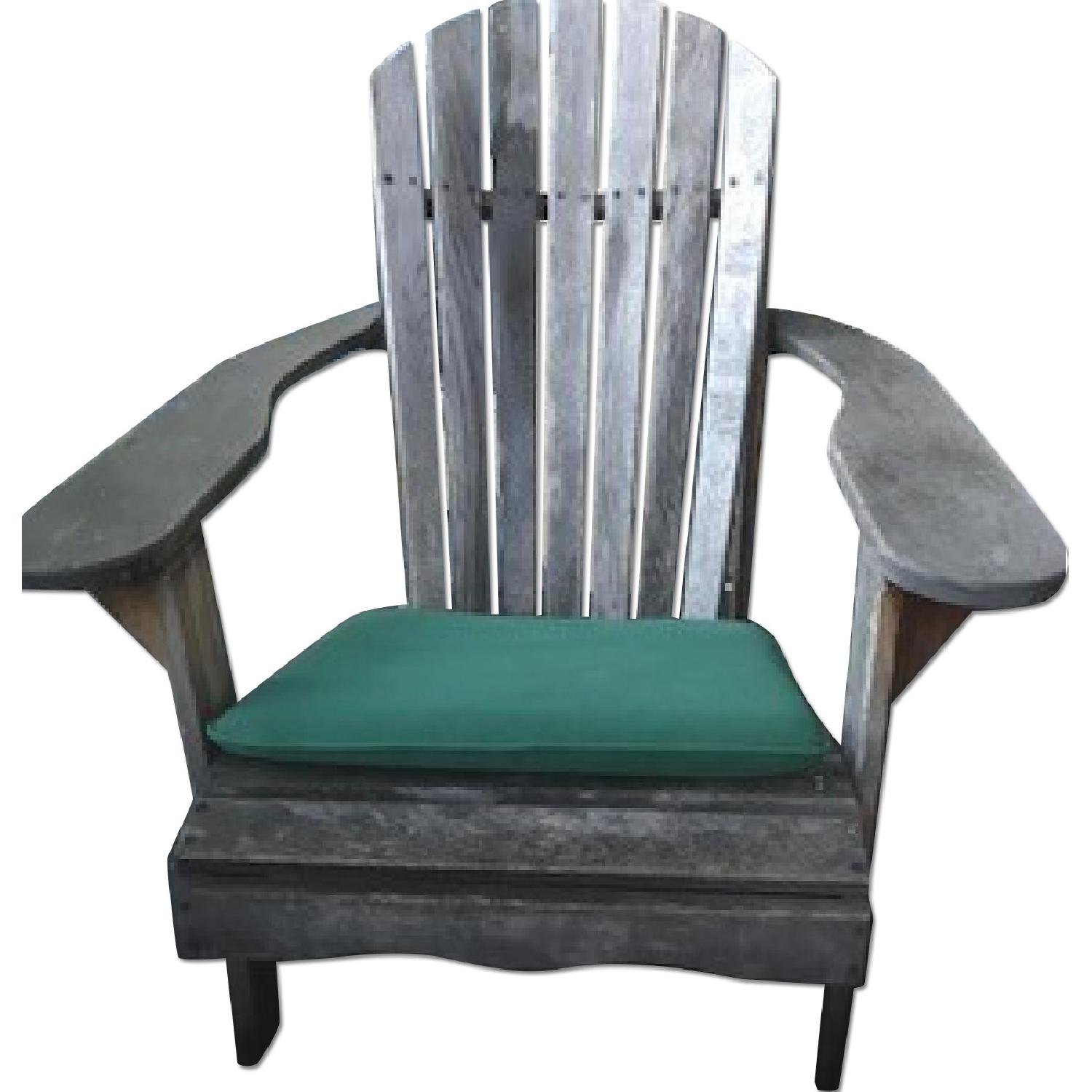 Seller's Notes:These chairs are very sturdy and made from natural wood and look weathered by not but not damaged. They are meant to withstand rain and snow. Green cushions included in perfect condition. Awesome for a patio or terrace.