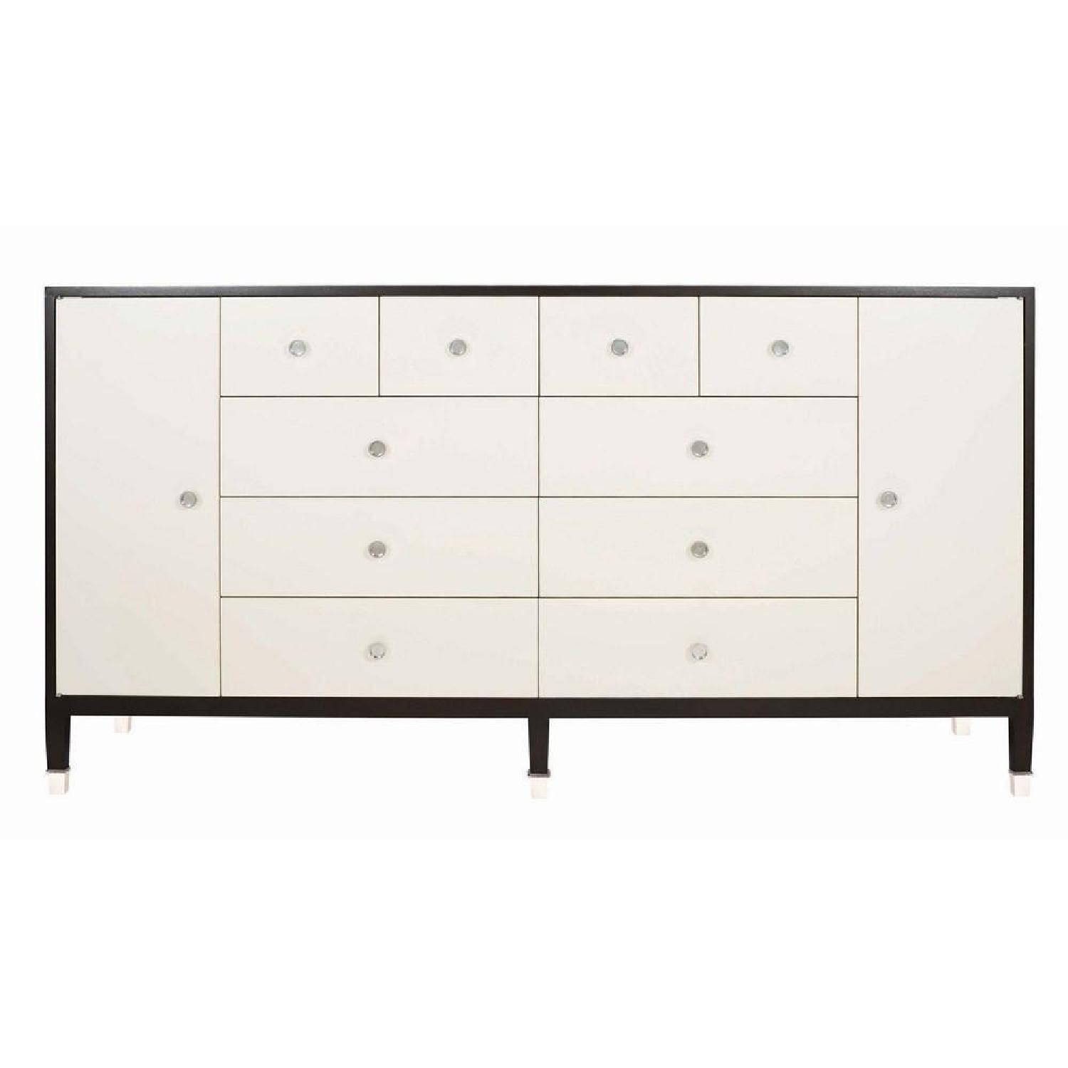 Seller's Notes:Selling luxurious designer piece that no longer fits in my home. Crafted from maple solids and veneers and features beautiful polished nickel drawer pulls and foot caps that compliment the glossy white finish of the doors. The adjustable shelves, english dovetail construction and jewelry tray testify to the detailed craftsmanship of this one-of-a-kind piece. 10 drawers and 8 shelves make this the ultimate storage. It's in nearly perfect condition with a hardly noticeable small scratch, highlighted here.