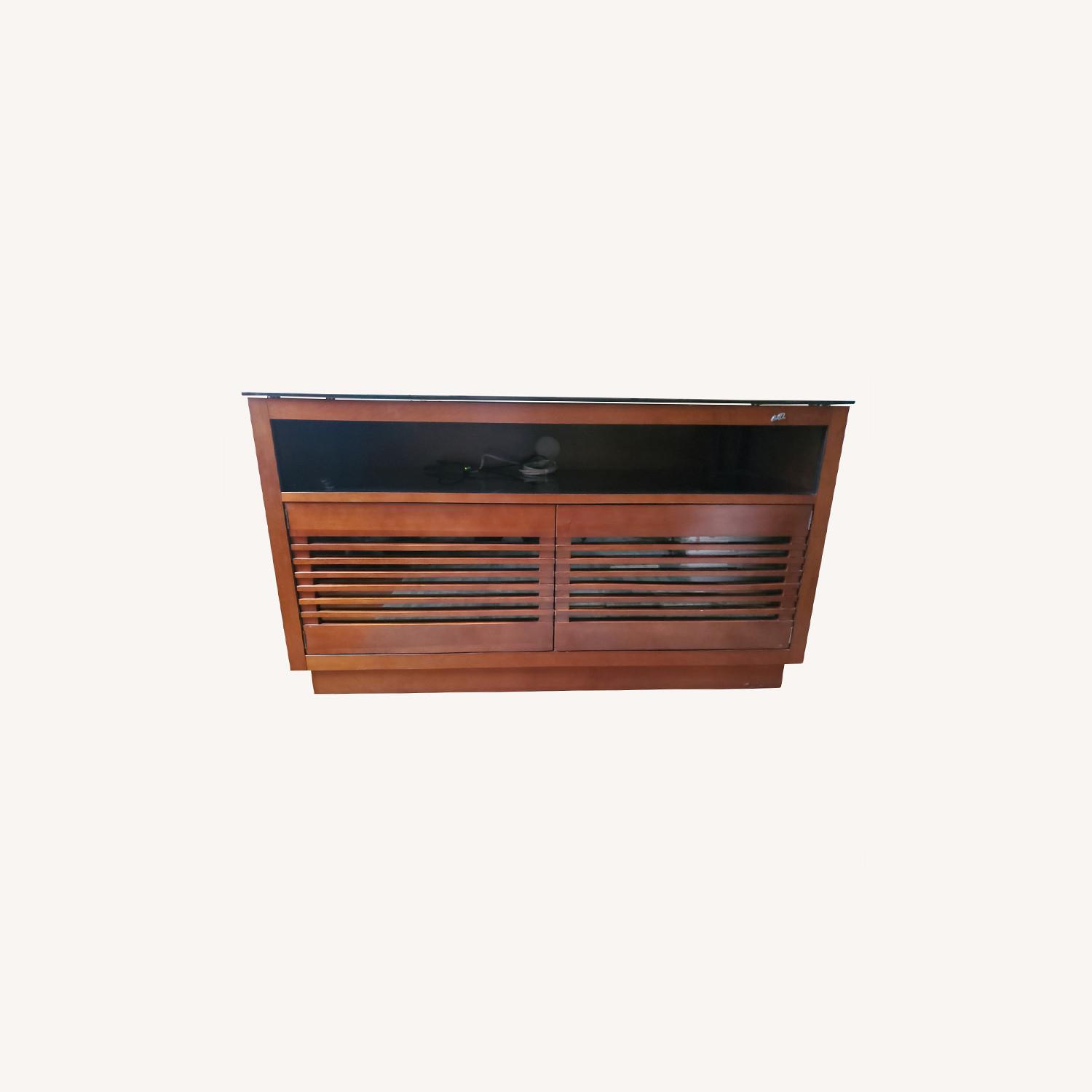 Seller's Notes:Black glass top and soundboard shelf. Cable management system in back panel for ez connections and proper ventilation. Tinted tempered safety glass doors. Interior adjustable tempered safety glass shelf.