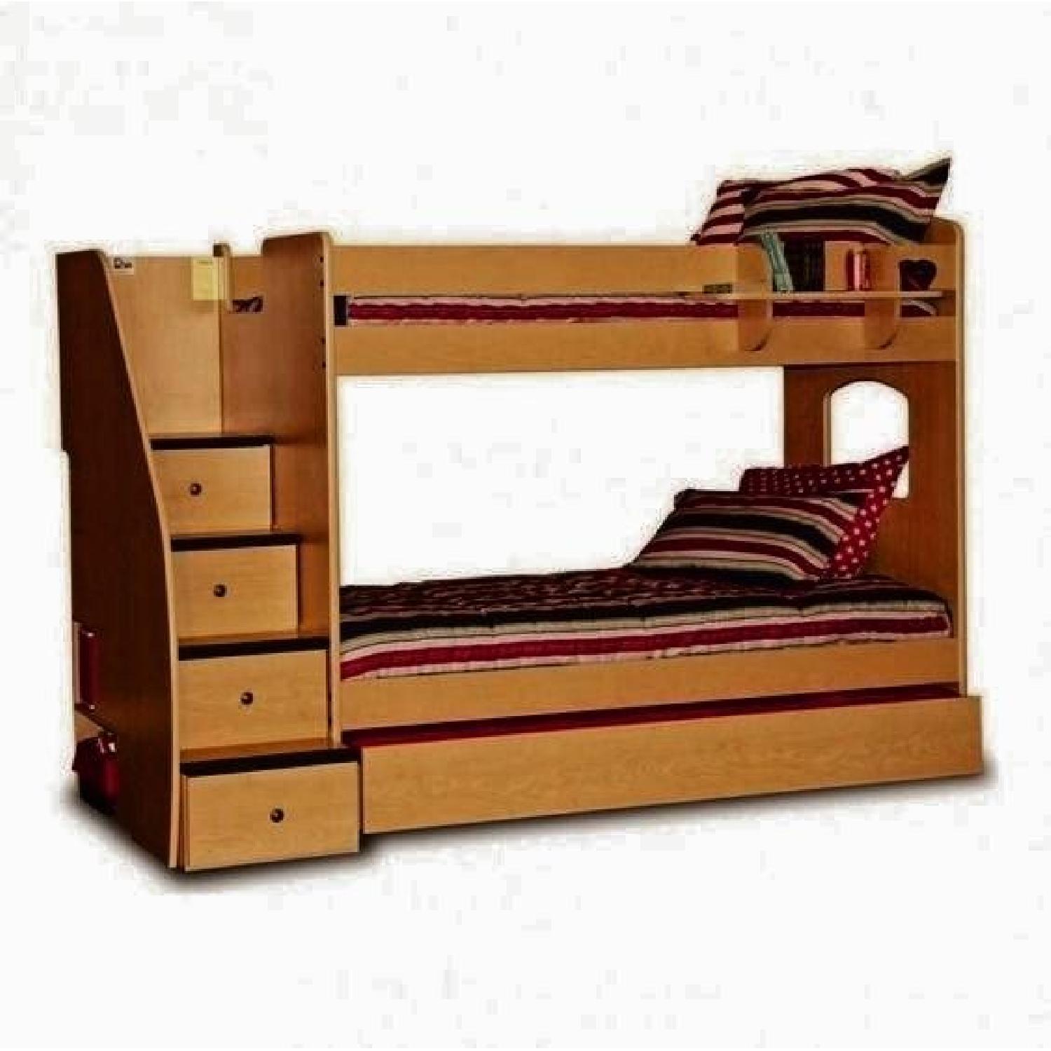 Seller's Notes:Excellent condition Berg authentic twin over full bunk bed with Berg's authentic signature "storage" staircase with 4 extra deep functional drawers. Includes trundle underneath the unit, providing an extra bed or additional storage space. Includes authentic shelf. Unit is Great for space saving while providing enormous storage options. The bed needs to be disassembled and removed (not included in the price.) Features • Premium quality construction for a lifetime of durability. • Steel hardware connections ensure rock-solid strength and stability. • Super-safe stairs with non-slip treads. • Four extra-deep drawers in staircase make it easy to put away child's favorite items. • Drawers feature easy to clean interiors and roller glides with safety stops. • Constructed with safety and quality in mind. • Modern styling, flexible designs with plenty of storage space. Dimensions 66 H 56 D 96 L