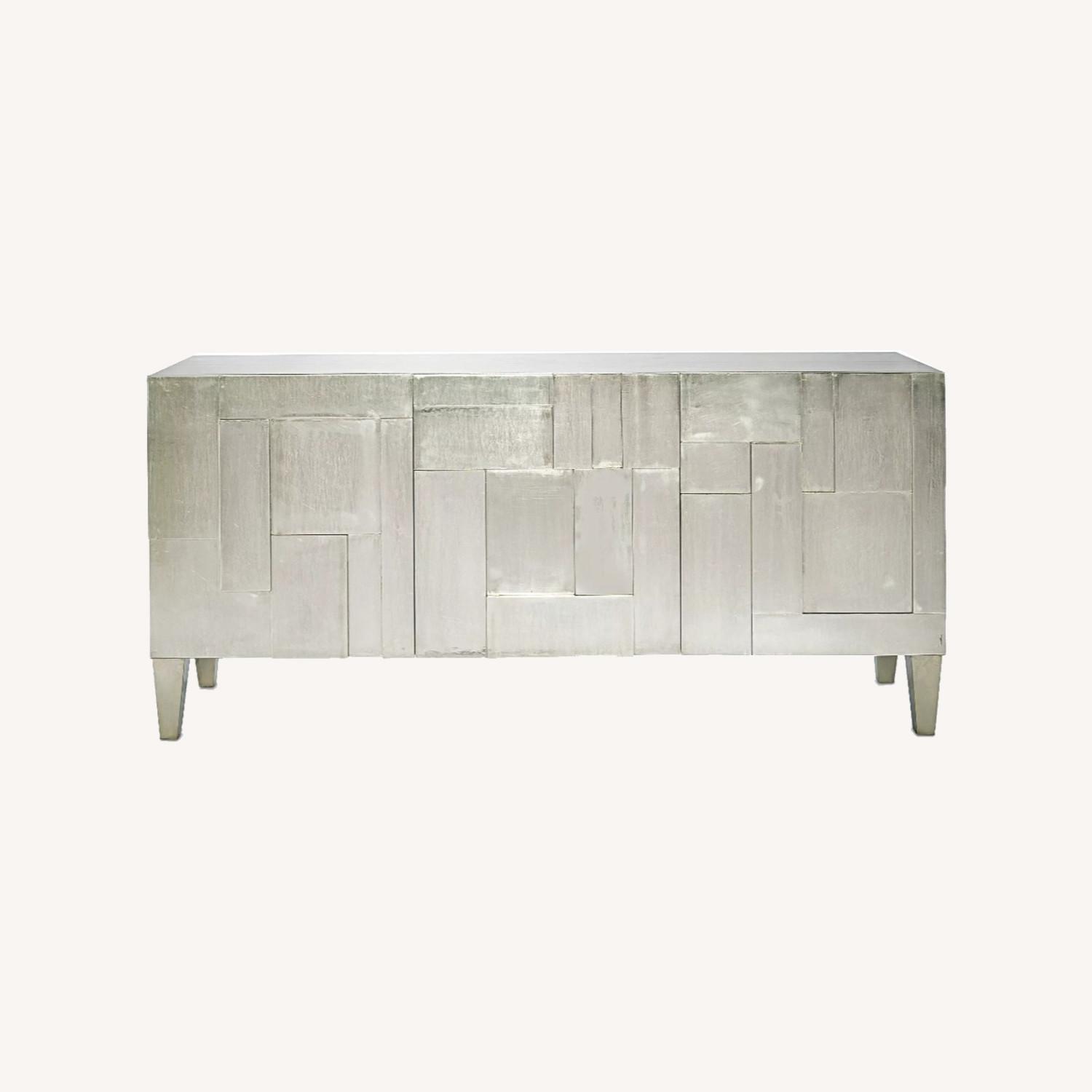 Seller's Notes:Hand-carved reclaimed teak body fully wrapped in German Silver nickel alloy with black Interior. Each piece handcrafted and artisan made. Painted black interior and case back. German Silver wrapped case—three doors; behind each door is one drawer with hand cutouts, one adjustable/removable shelf and one covered grommet hole in back panel for wire management. Entertainment console. Two drawers; two adjustable shelves. Teak/nickel alloy. Light assembly may be required. Hardware and instructions included. Approximately 72"W x 20"D x 34"H. Boxed weight, approximately 341 lbs.