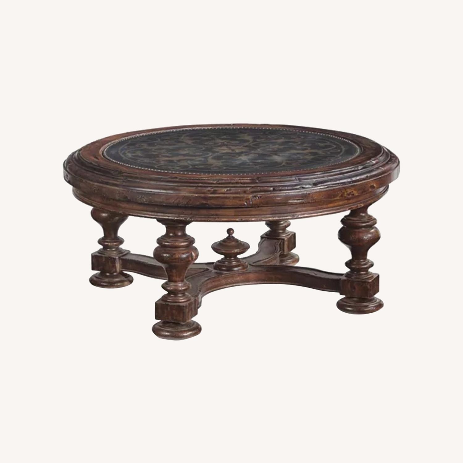 The Marquis Round Cocktail Table by Bernhardt is a very traditional cocktail table with some European influences. The Gemelina wood is distressed for a more rustic effect and the ornamental legs and stretchers make this table very sophisticated.