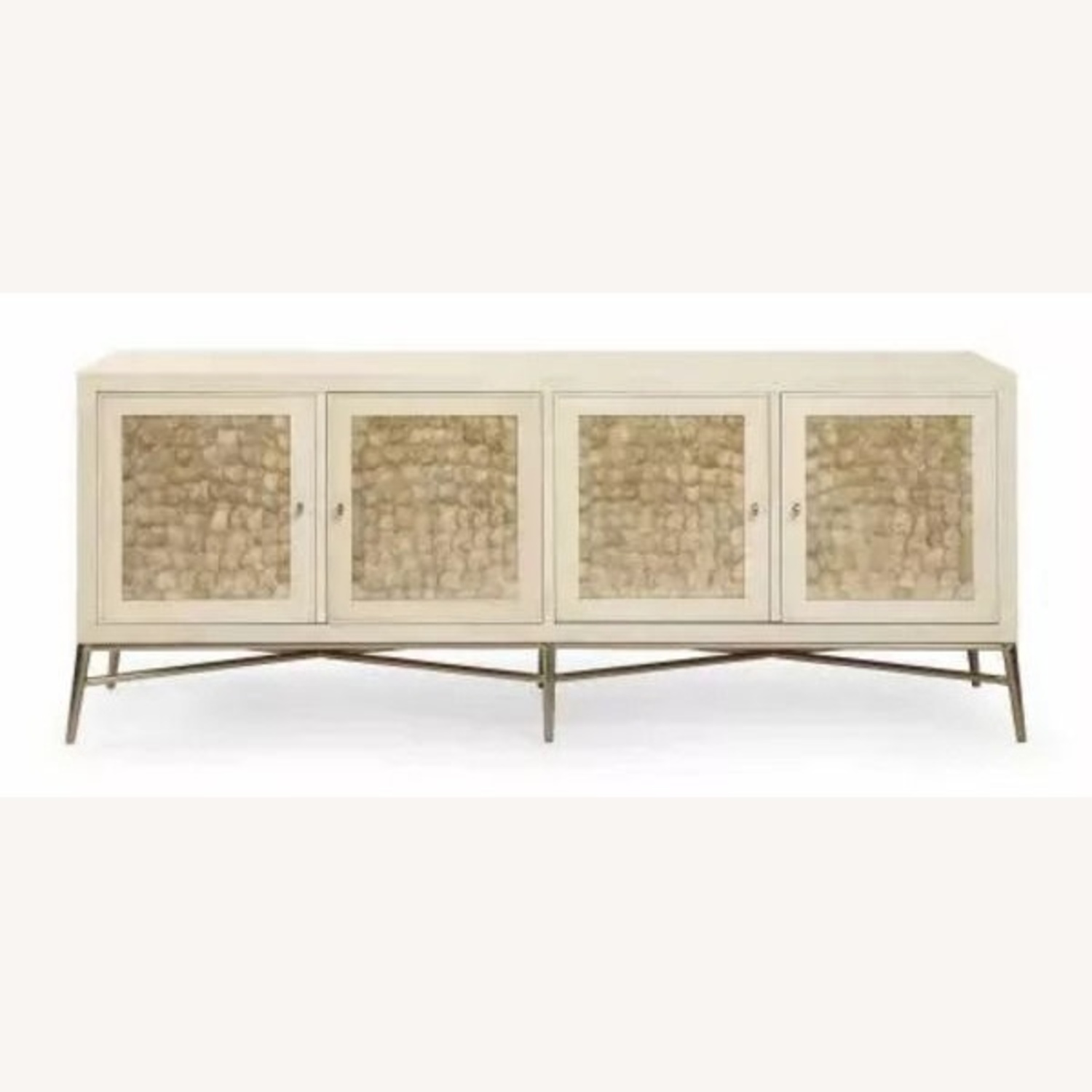 This Salon Buffet is the perfect addition to any home. Crafted from maple veneers, this buffet features an alabaster finish that will add a touch of elegance to any room. The two sets of doors are adorned with inset Capiz shells for an extra bit of style and sophistication. Behind each set of doors is one tray drawer and an open compartment, providing ample storage space for all your dining needs. The left tray drawer has a wrapped pad while the right tray drawer has a silverware insert – perfect for entertaining guests! The metal base with stretchers ensures stability and durability while adjustable glides make it easy to move around as needed. This buffet is ideal for those who want both beauty and function in their furniture pieces. Not only does it look great in your dining area or living room, but you can also store all kinds of items such as dishes, cutlery and more inside its drawers and compartments – making it so convenient when hosting dinner parties or get-togethers! Its 32” x 79 ¼” x 20 ⅝” size allows you to place this piece in even smaller spaces without compromising on style or functionality. Whether you’re looking for something classic or modern, this Salon Buffet fits the bill perfectly. Its timeless design will never go out of style while its practical features provide convenience like no other furniture piece can offer! Add some sophistication to your home today by investing in this beautiful buffet!