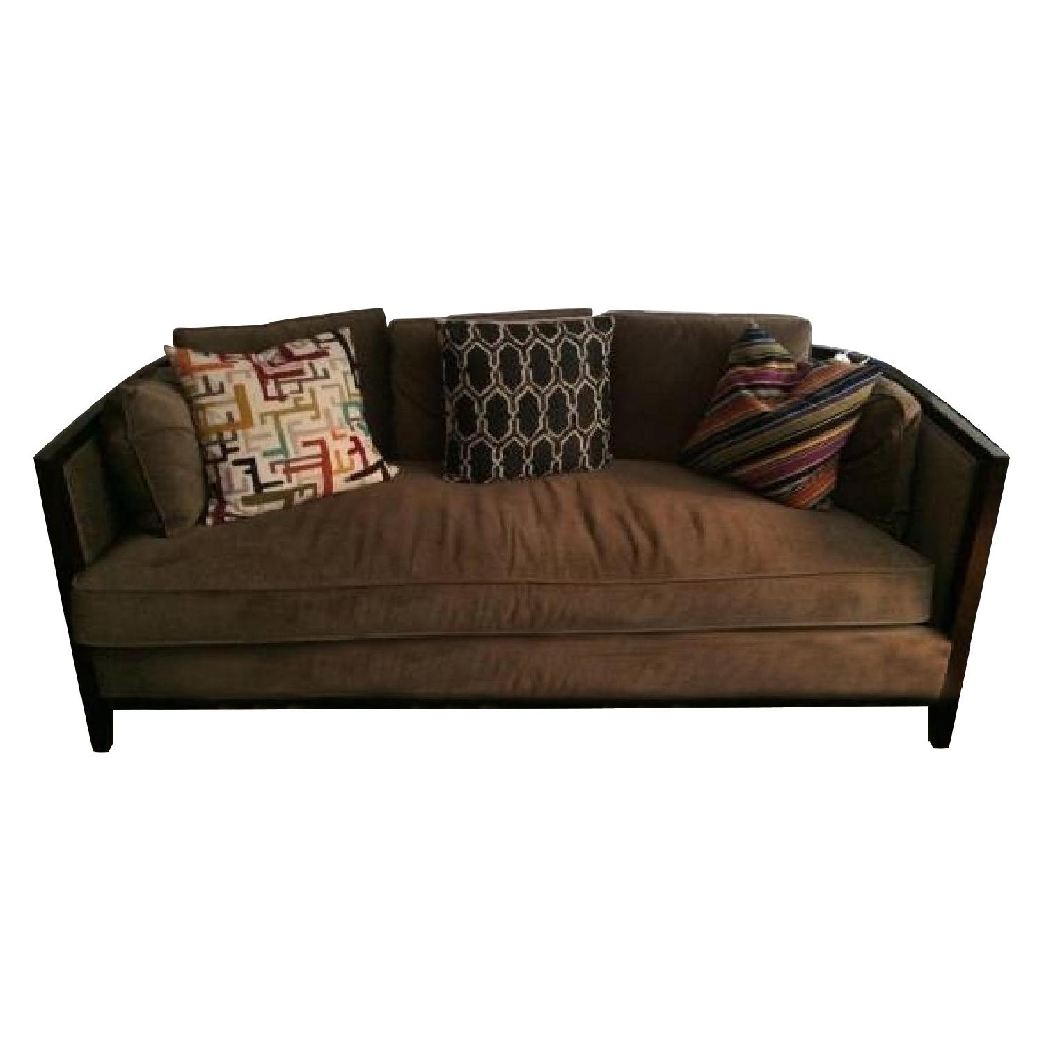 Seller's Notes:Bernhardt neutral velvet sofa, great for a living room, large bedroom or loft space. Accented with dark brown wooden frame, and 3 large and 2 medium matching pillows. Excellent condition, and very chic. Purchased from Wayfair - in line with the Pottery Barn / Crate and Barrel look. Goes great with rustic pieces as well as in more formal settings. Comfortably accommodates 3-4 people.