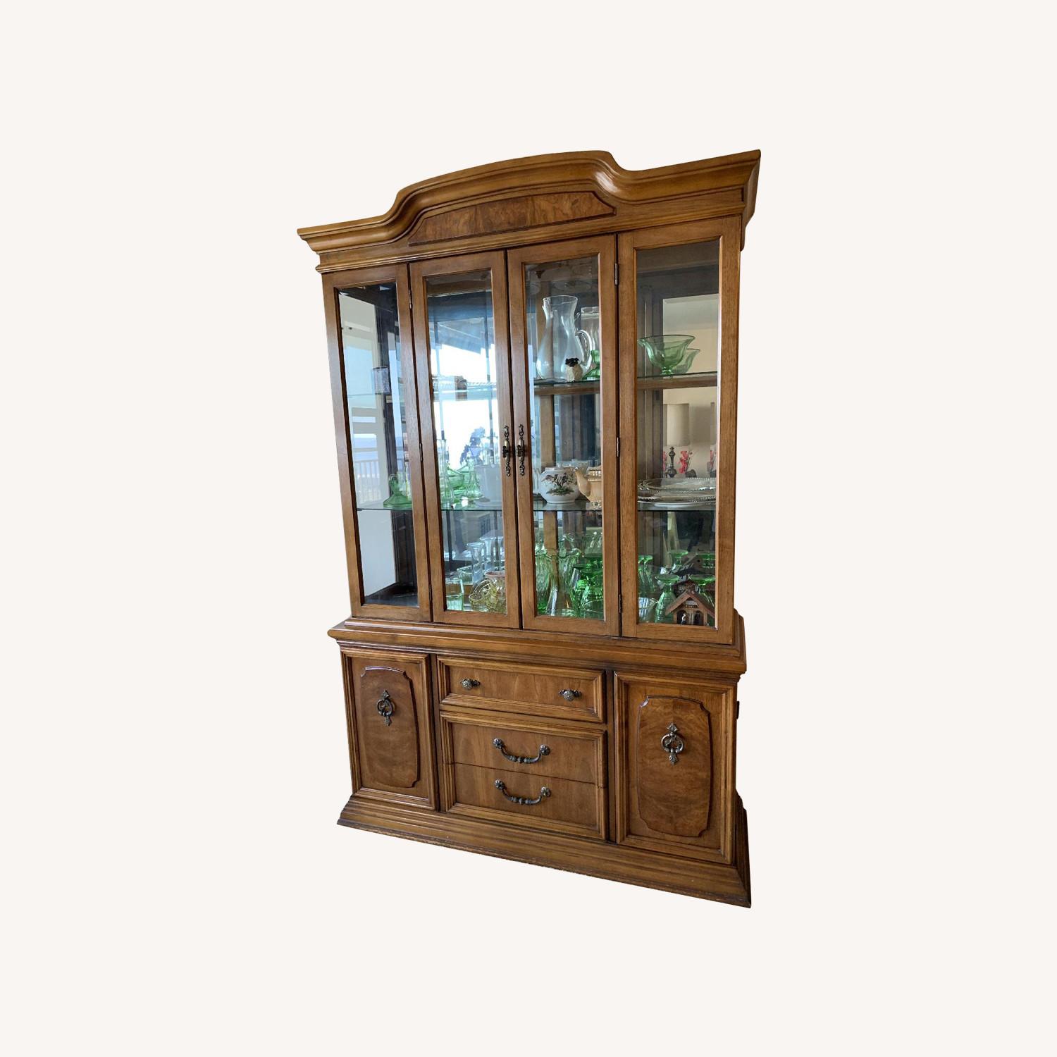Seller's Notes:Vintage Bernhardt Furniture illuminated china cabinet is two parts, designed so the glass-fronted china cabinet sits on top of solid storage. The china closet has three levels of display on two clear glass shelves and solid bottom. The display area is lit by two separately controlled interior lights. There's ample storage in the bottom with three drawers including a tri-divided felt-lined top drawer. Cupboards on either side of the drawers are each divided by a single shelf.