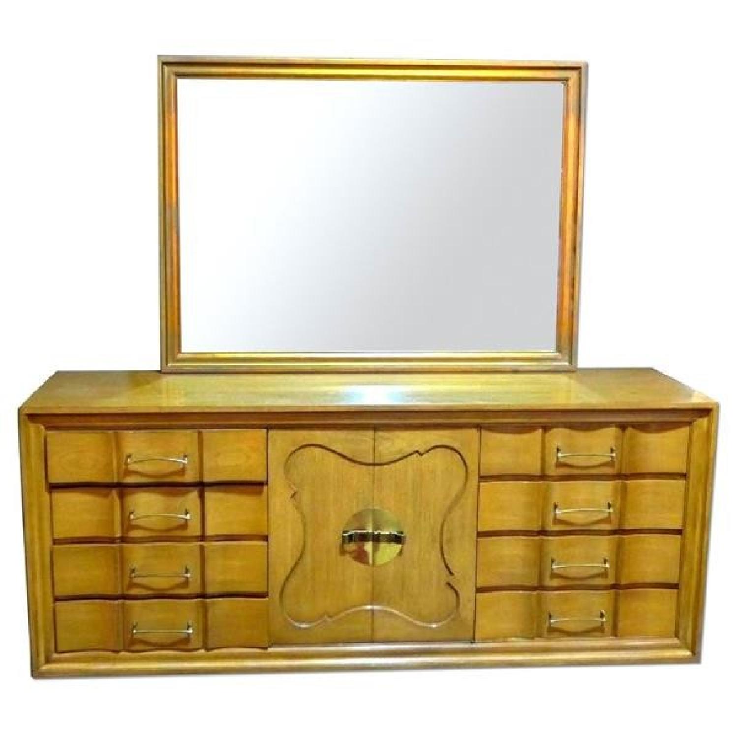 Seller's Notes:Express a distinct style and taste with this striking yet elegant modernist dresser with large gilded mirror, and you will love the sophistication it adds to your home décor. Made by Bethlehem Furniture Manufacturing, Pennsylvania; maker's label in drawer. The dresser measures 32 1/4" H x 76" W x 22" D. Very solid, heavy piece. You can find matching tall dresser, king size bed and a pair of nightstands among the images provided. Those pieces are offered in separate listings; this listing is for the dresser and mirror only. Please contact us if you are interested in a set. Bethlehem Furniture Manufacturing Corp. of Allentown, Pennsylvania was founded in 1920 by Theodore Goodman and became a preeminent manufacturer of fine, custom furniture. Each piece was handcrafted to perfection and is a tribute to those who appreciate excellence. In a world of temporary pleasures, Bethlehem Furniture created beautiful furniture that remains a joy forever. *****Treasure Island Interiors***** This fabulous dresser is in a class of its own, possessing all the beauty and uncompromising quality you would hope for from the finest examples money can buy. Its definition, structure, refined lines and overall finish exemplify premier craftsmanship not often encountered. Adding exclusivity to your décor, this gorgeous dresser offers an elegant and stylish look wherever placed. It is unique in its structural integrity and its perfect functionality, exhibiting blending of creative style balanced with careful proportion and scale. This wonderful piece is beautifully proportioned and is very decorative, yet spacious enough to be incredibly useful, with storage galore for anything you may need. Use your imagination to find a place in your home for this exquisite statement piece of huge character that will become a stunning focal point wherever placed. Sophisticated yet practical, impressive yet informal – this remarkable dresser is meant to function within the realities of day-to-day living while allowing you to create a space that best amplifies your personal style. ****Treasure Island Interiors**** Offered in very good vintage condition; minor signs of use consistent with the normal, residential employment it has seen. May have minor scratches, scuffs and chips, but nothing that detracts hugely from the beauty of the piece. The pictures are of the actual item you are purchasing, so please look at them closely to confirm its condition and outstanding appearance, as they are part of the description. Comes from a clean, non-smoking, pet-free home. This is a great opportunity to purchase this wonderful piece at a fraction of its original cost, and we have no doubt it will serve and delight its new owner for many years to come.