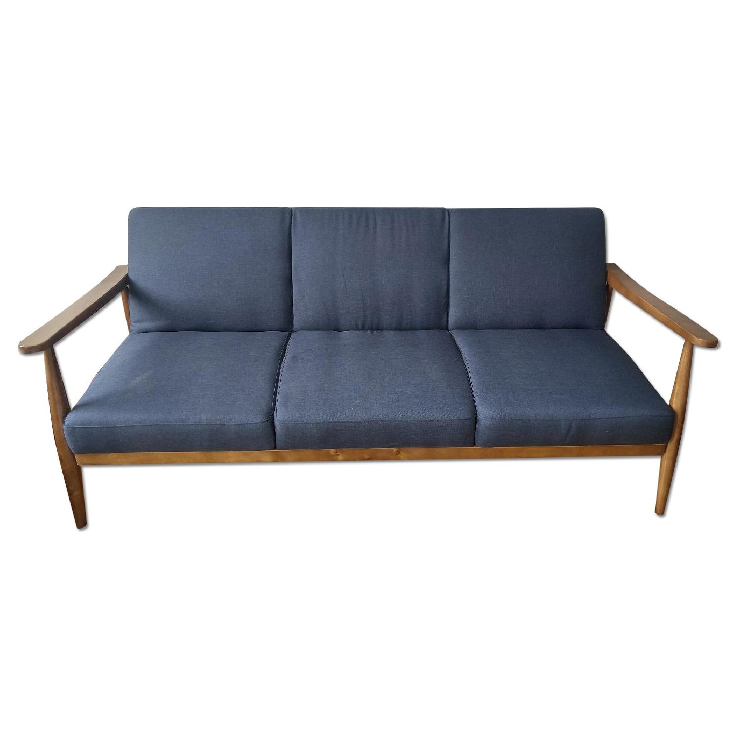 Seller's Notes:Chic Mid-Century sleeper sofa in classic Navy Blue linen upholstered fabric and smooth wooden frame. Color/Material: Navy Blue/Linen with wooden frame in Pecan finish. Bought new and have had it for less than one year in a non-smoking, no pet home. Barely used so really looks brand new. Am selling it because I moved home and it doesn't work in the new place. Fits through doorways without having to disassemble it!! Easy to assemble and disassemble if required and comes with instructions. Easily fits 3 people comfortably. Converts into bed very simply with just one movement (push the sofa back forward to release). Sleeps 1 comfortably or a couple or 2 people who know each other well!
