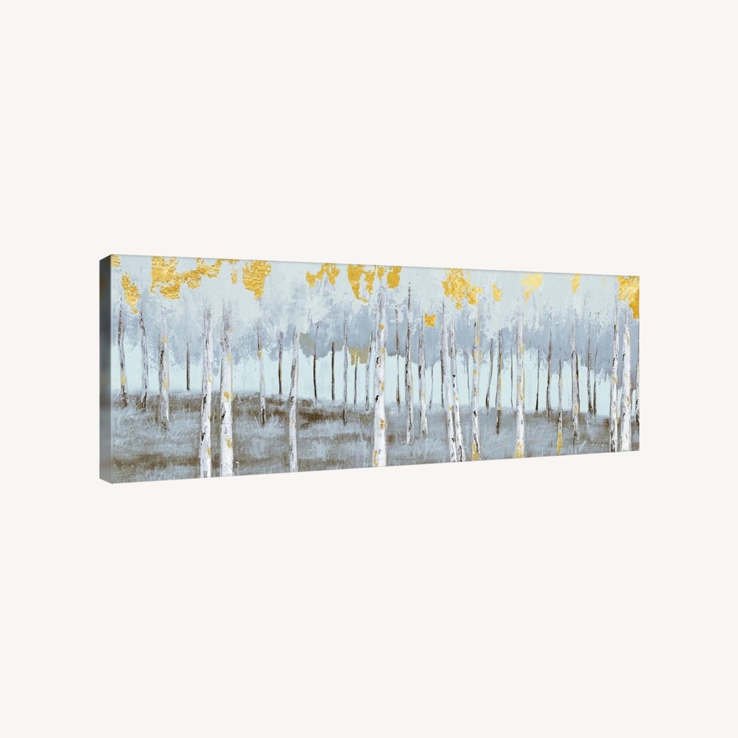 Seller's Notes:Contemporary painting of a grove of grey birch trees with bright gold leaves stretched over canvas. Dimensions: 48” x 19” x 1.25”