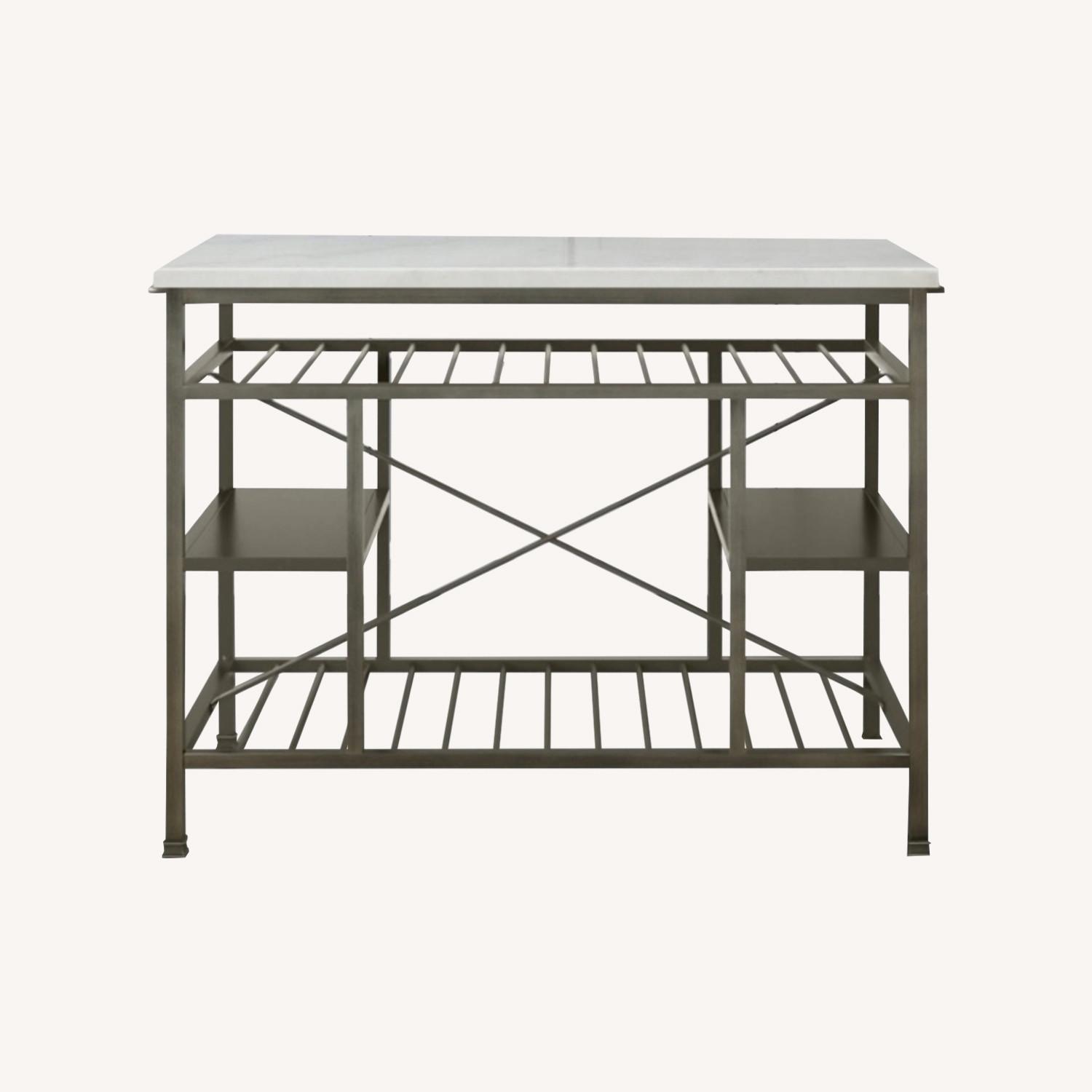 Seller's Notes:Marble prep table/kitchen island with antique pewter finish. We bought this island specifically for our current apartment (barely two years old!) and this won’t work for our new place. There are very very very minor scratches (you wouldn’t notice unless you’re looking hard). It holds a ton of stuff and the marble top is stunning!