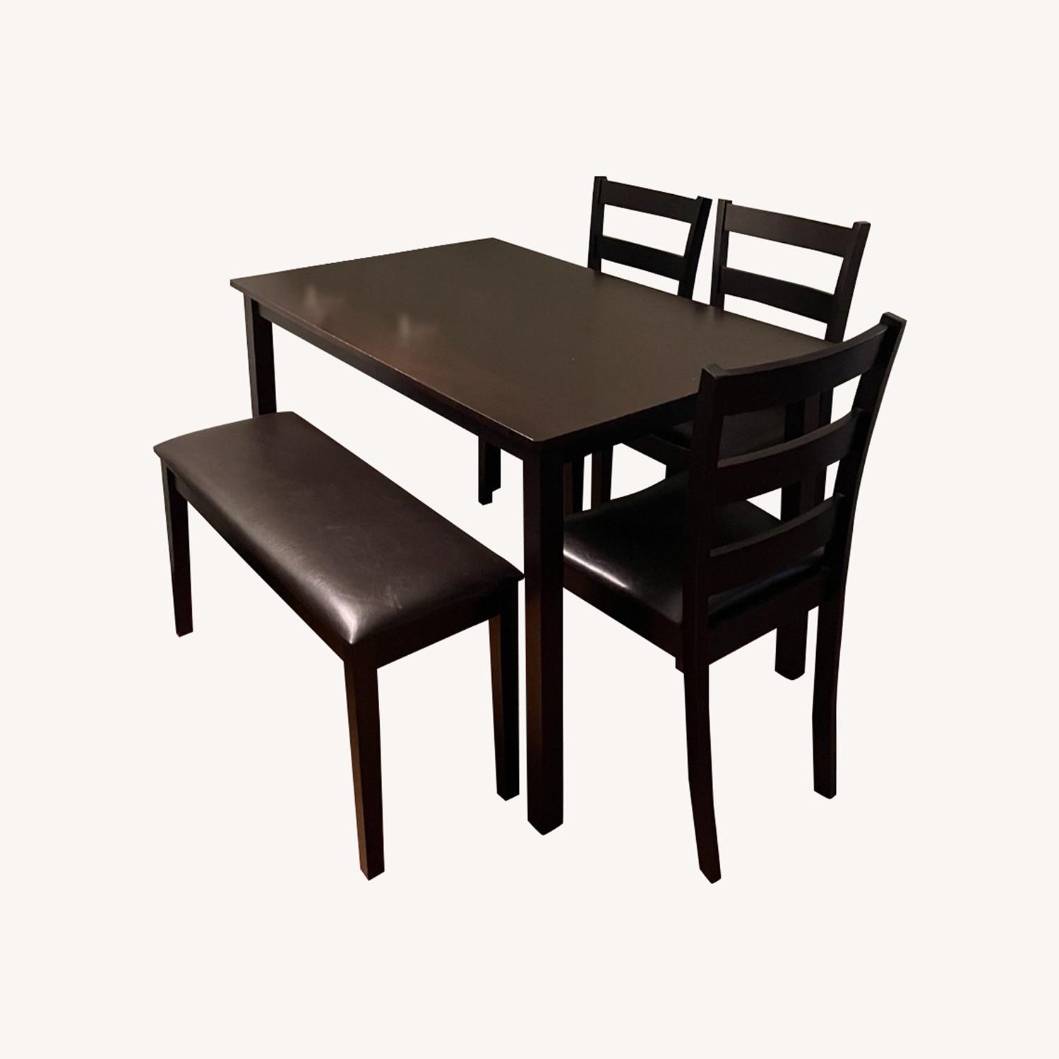 Seller's Notes:Black table w/ 3 matching chairs and bench - perfect for small apartments, seats 5 ppl easily