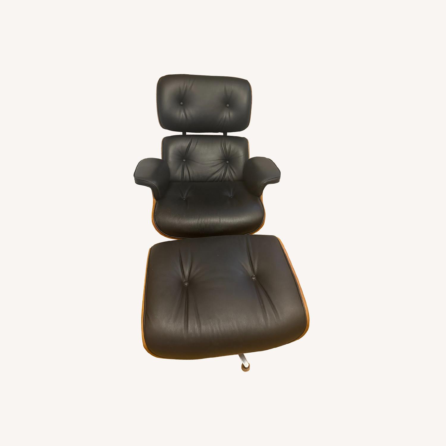 Seller's Notes:Black faux leather armrest with ottoman included (dimensions are for armchair only, footrest separately measures 25"W x 21"D x 16"H). Has minor scratches from a cat on chair base - see photos. Brand unknown (it's a replica Eames design; does not swivel).