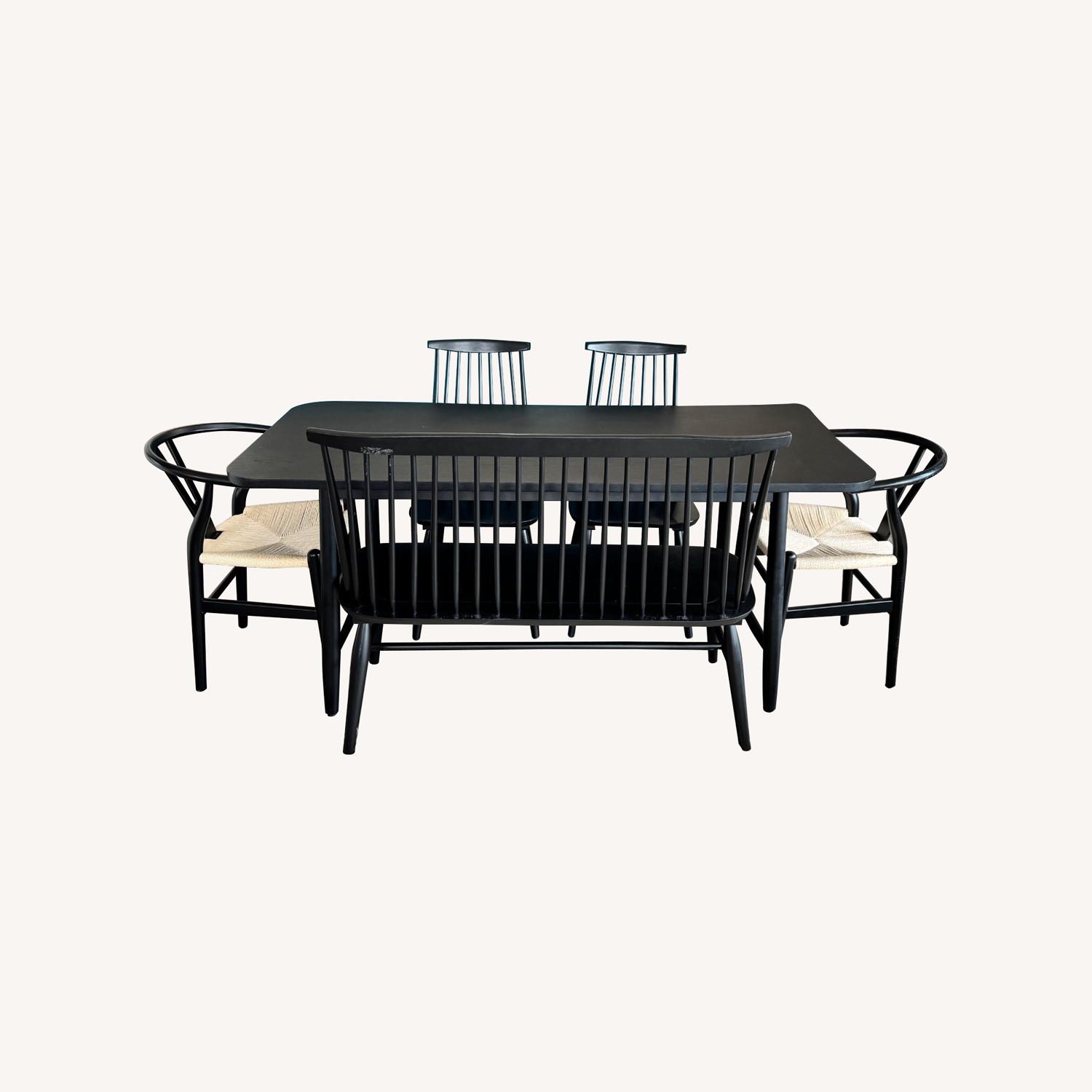 Seller's Notes:Beautiful black dining table set from Hearth & Hand with Magnolia. It comes with 1 bench and 4 chairs. The set is sturdy and stylish, perfect for everyday use or gatherings. Overall, it’s in good condition — just a few minor scratches from normal use, and one of the chairs could use a little touch-up on the paint. Still a high-quality, timeless piece that will look great in any dining space! I bought 3 years ago but just want to remodel my house. No pets, no smoke house!