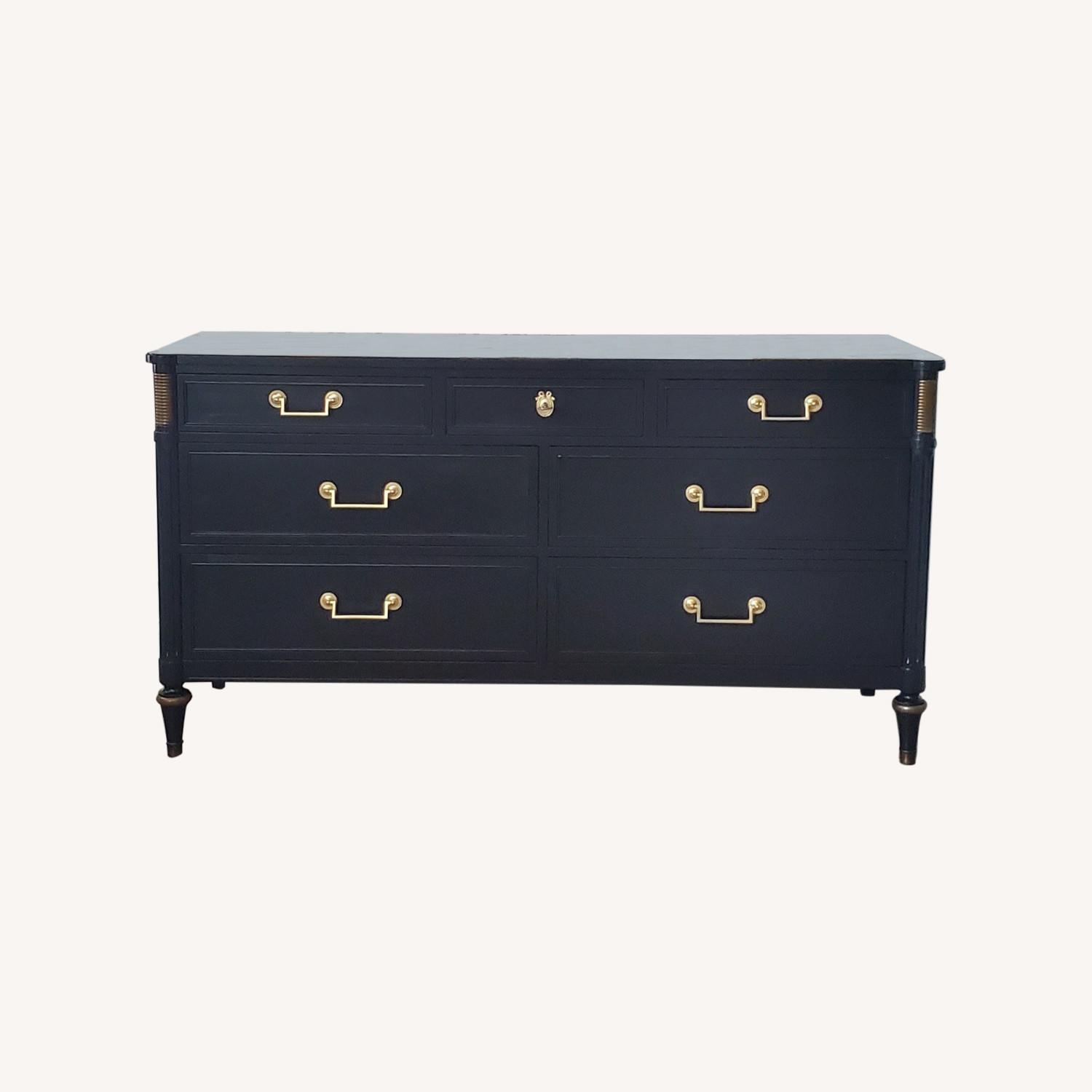 Seller's Notes:If you've been looking for the perfect black dresser, this is it. Presenting this Kindel French Regency beauty, painted in SW's Tricorn Black, a true black that is sure to fit into any existing decor. The classy French Louis XVI lines combine with the newly polished original brass hardware for a stunning modern silhouette. The seven dovetailed drawers slide smoothly and were lined with an elegant paper to elevate her even further. Added bonus, the middle drawer has a beautiful functional lock and key. Sealed for durability. Quality piece sure to last you many years. This piece is refinished and may contain minor imperfections. Measurements: 60.75 x 19.25 x 32.25 inches