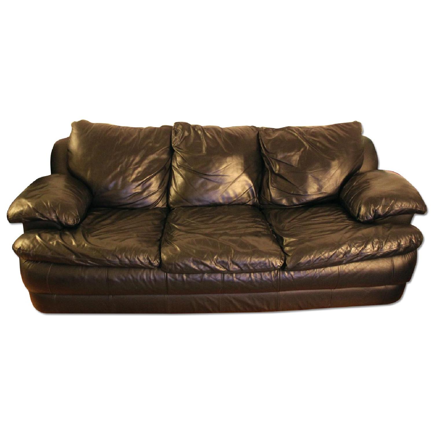 Seller's Notes:Beautiful Black Leather Sofa for sale! Purchased in a family furniture store in suburban NYC. Can comfortably and easily seat 3 people. This sofa is durable, comfortable, and great for napping and lounging. Matching loveseat also for sale making this a great set (separate listing). There is a rip in between 2 of the seat cushions (not visible unless you pull cushions apart). This rip can easily be fixed with some liquid leather. Cushions are not removable. Easy to clean.