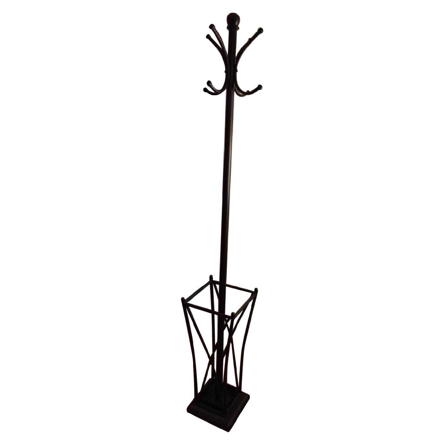 Seller's Notes:Handsome black metal hall tree holds a gazillion coats, scarves, caps. Added bonus: 10"x10" umbrella stand keeps those 'brellas from dripping all over your floor. Fits in tight spaces. Time to let go - hope you enjoy.