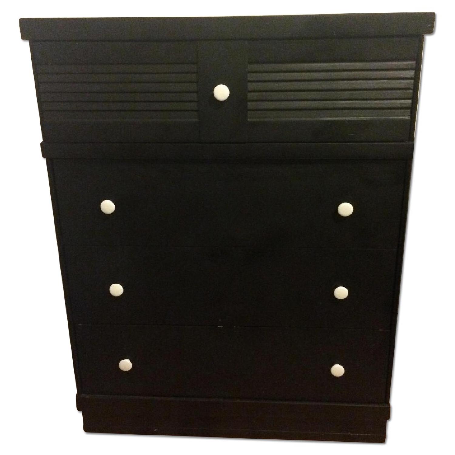 Seller's Notes:I got this piece from a friend when I first moved into the city. I am now moving out and no longer need it. I used it in the living room for storage, since it looks less bedroom dresser than a typical dresser, and the top served as a bar while the drawers held non-everyday items. When I got the dresser it was black, and I spray painted it satin black to clean it up a bit. Most of the scratches are not deep and can be covered with paint. The drawers are a bit annoying because it's an old solid wood dressers (there is friction between the wood when you pull it in or out so it doesn't glide smoothly). I've heard this is fixable with some WD40, but I've never done it or tried. Other than some scratches/ minor dents and wood drawer annoyance, the dresser is great. The piece is structurally sound. It would be a great fixer upper piece since it has great bones. It could probably be totally refinished to look however you want, especially if you sand it down to the wood and stain it. The knobs on all of the drawers can easily be replaced, they're the normal screw on ones.