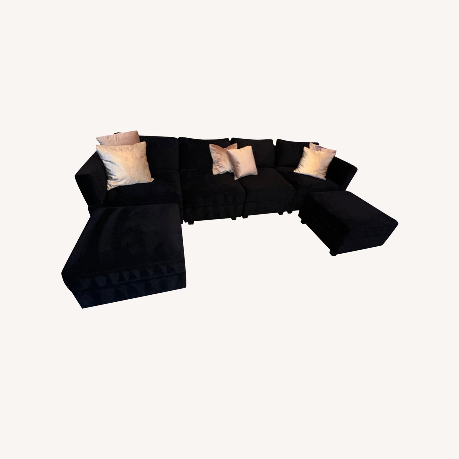 Seller's Notes:Black velvet modular sofa. Brand new just purchased and doesn’t fit my space. Can be moved and rearranged to other shapes and has storage under every section. Smoke free home. Dimensions are in photo.