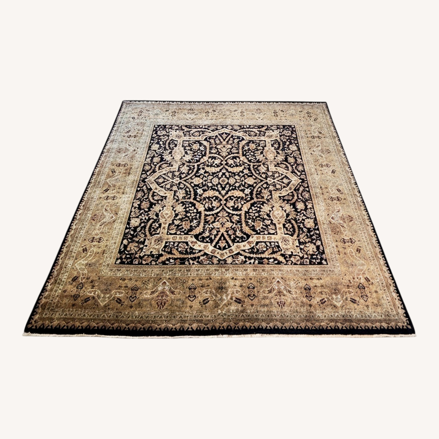 Seller's Notes:This elegant hand-knotted area rug features a timeless traditional design with a rich dark field contrasted by a warm beige border. Intricate floral and vine motifs create a refined, symmetrical composition that adds depth and sophistication to any space. Crafted from high-quality wool, the rug offers both durability and a soft, comfortable texture underfoot. Its neutral yet striking color palette makes it easy to pair with a variety of interiors — from classic to transitional. The rug is in good pre-owned condition with minor signs of wear consistent with use, but overall remains beautiful and fully functional, ready to enhance a living room, dining area, or large open space. Size: 12.3’ x 12’ Condition: Good (gently used) A great opportunity to bring a large, statement-quality rug into your home at a fraction of retail price.