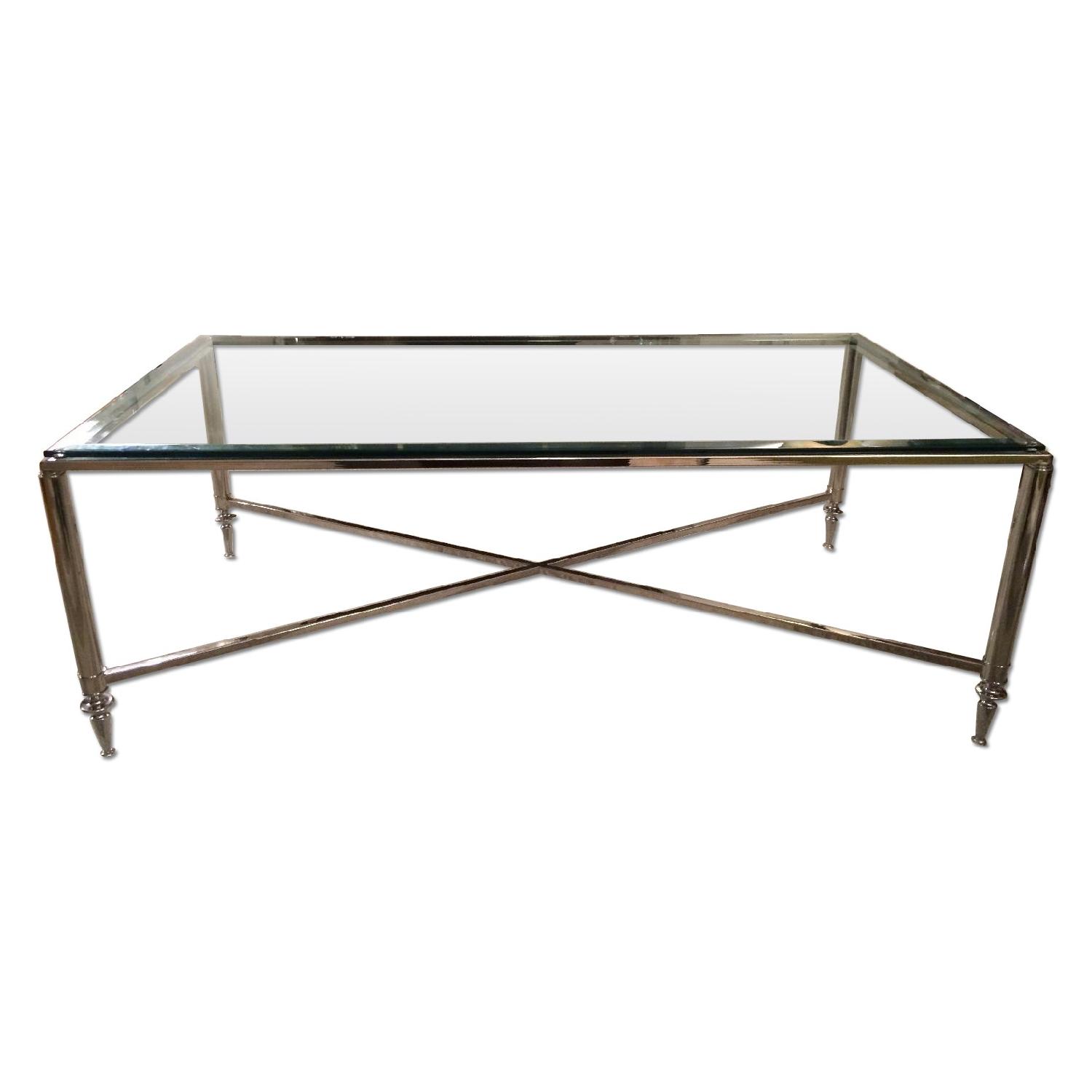 Seller's Notes:Deco-style coffee table with x-base , detailed footing and ample glass surface.