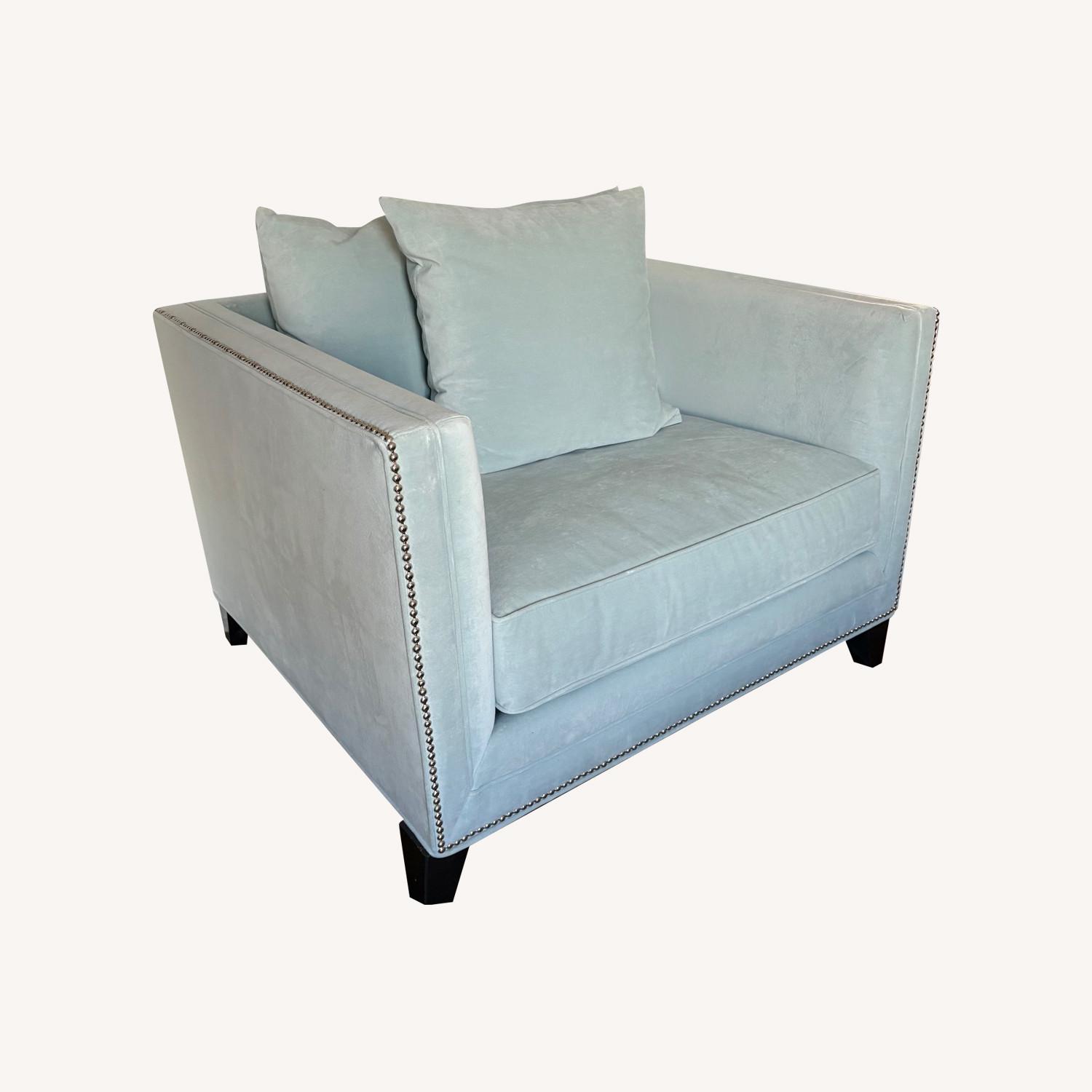 Seller's Notes:Gorgeous Tiffany Blue Arm Chair with Nickel Studded Accents from Macy’s Purchased new for $800 Excellent condition, but I purchased one too many for my living room.