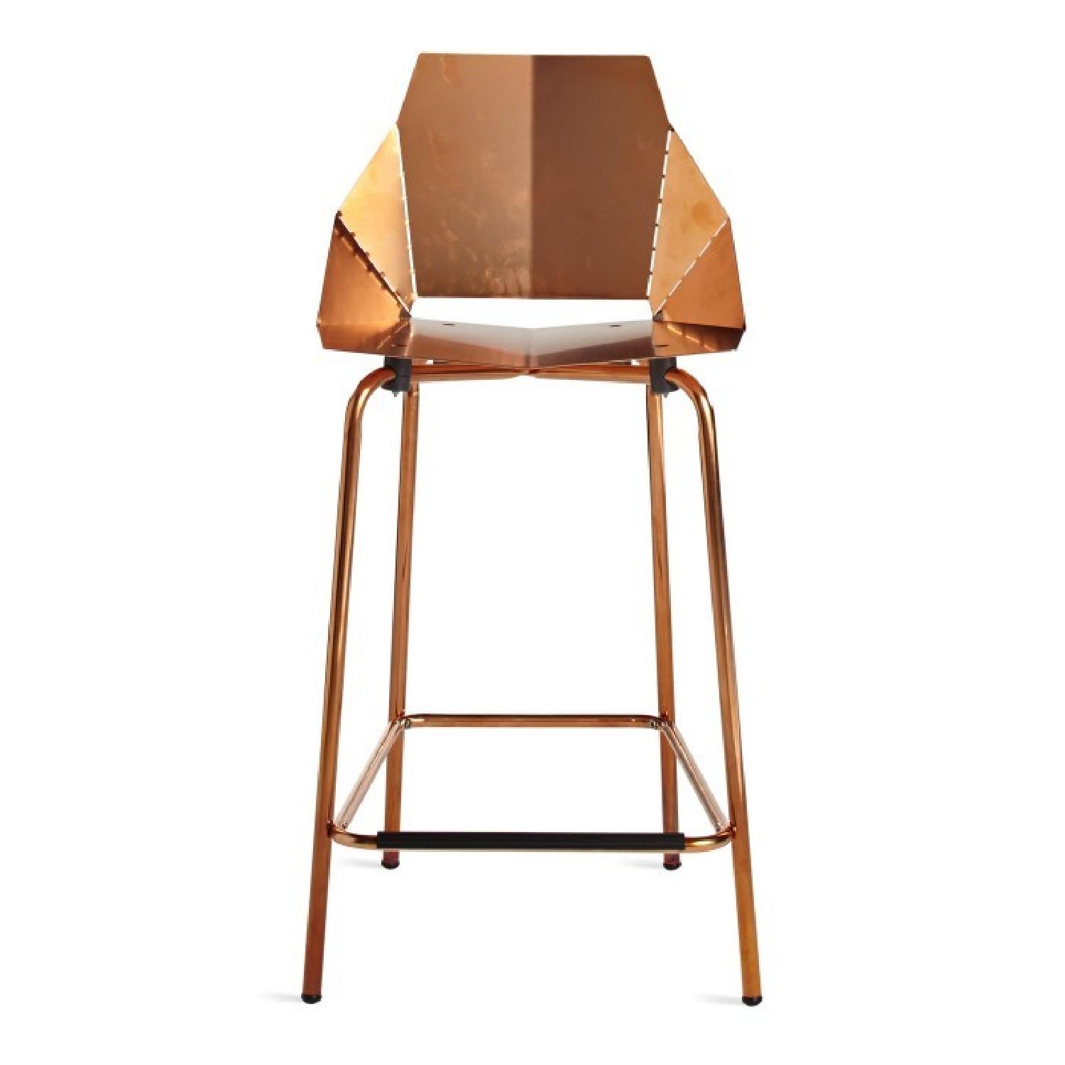Seller's Notes:Set of 3 modern designer Blu Dot copper counter-height stools. Retails for $399+tax per piece. Beautiful natural patina on copper, may also be cleaned with salt and vinegar paste to make it shiny and perfect. Can buy one or as a set.