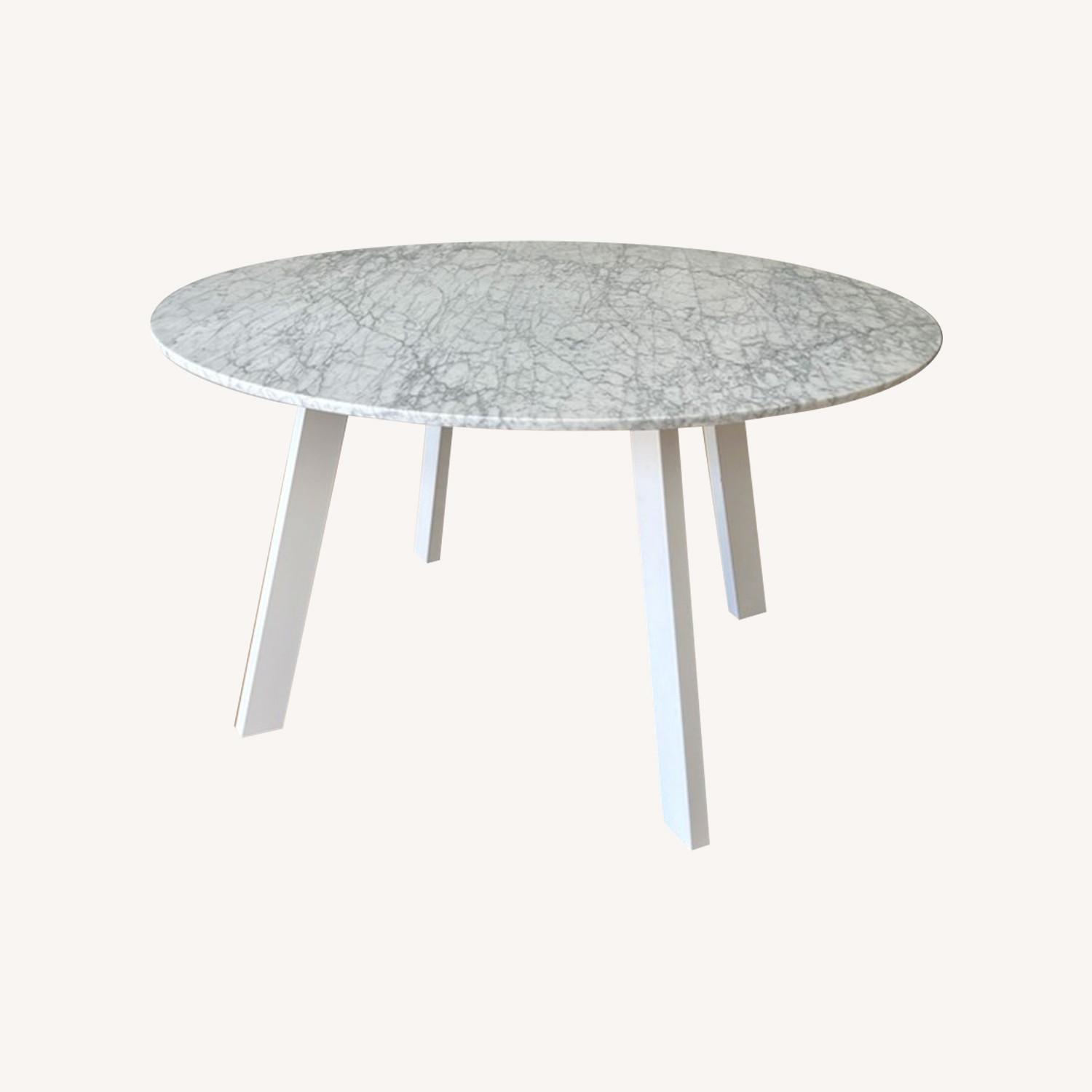 Seller's Notes:Blu Dot Right Round 52" marble table. Four powder-coated steel legs provide a sculptural and sturdy base for a honed Carrara marble top. An easy companion to any chair, the design holds its own in the dining room, office or entryway. Powder coated steel base in matte finish. Seats four comfortably. Used as a dining table for 1 year. We are selling because we need a larger table for our growing family.