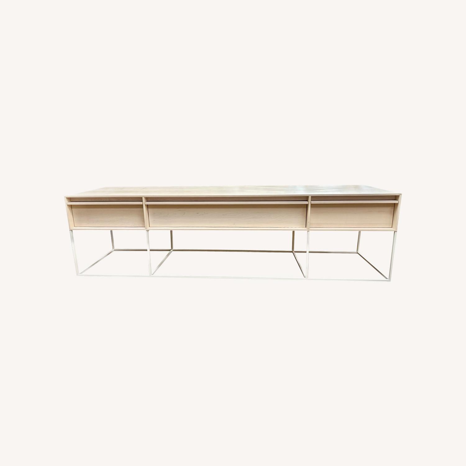 Seller's Notes:Blu Dot’s ‘Rule Long and Low’ credenza / dresser / bookshelf / desk, in brand new, never used condition, features: * 3 deep soft close drawers for smooth and silent closure * Dusk drawer interiors * Maple wood with veneers and white powder-coated steel base * Unfinished wood back Originally retailed for: $2,995 Selling here: $1.400 Overall: 84”w x 20”d x 23”h Outer Drawer Interior 7" H X 20"' W X 20" D Cabinet Interior 7" H X 41" W Clearance - Floor to Bottom 13" H Overall Product Weight 140 lb. From Blu Dot: The Rule Collection serves up well considered planes and angles that are ready to slay clutter in any room. Soft-close, deep set drawer fronts, detailed by a wood pull, reinforce the linear design and create a seductive shadow line. Dusk-colored drawer interiors provide a surprise dose of color while a square steel base ties it all together to form an elegantly, uncomplicated form.