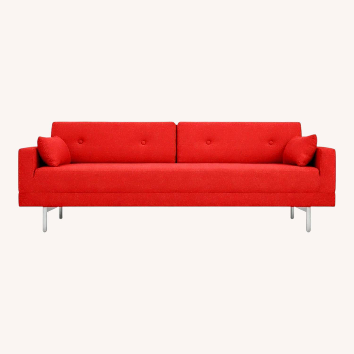 It’s a modern sofa bed that doesn’t look like one. Sort of like a wolf in sheep’s clothing. Just remove the back cushions and flip the seat forward. Voilà, instant queen-sized mattress. Brushed stainless steel leg.