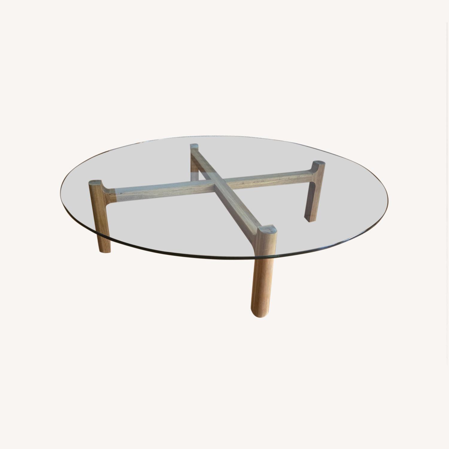Seller's Notes:Beautiful Blue Dot glass coffee table, good as new. The base is real walnut in a natural finish, and the glass is heavy and sturdy. There is one scratch on the glass that you'll never notice. We love the table and are only parting with it to accommodate a new space.