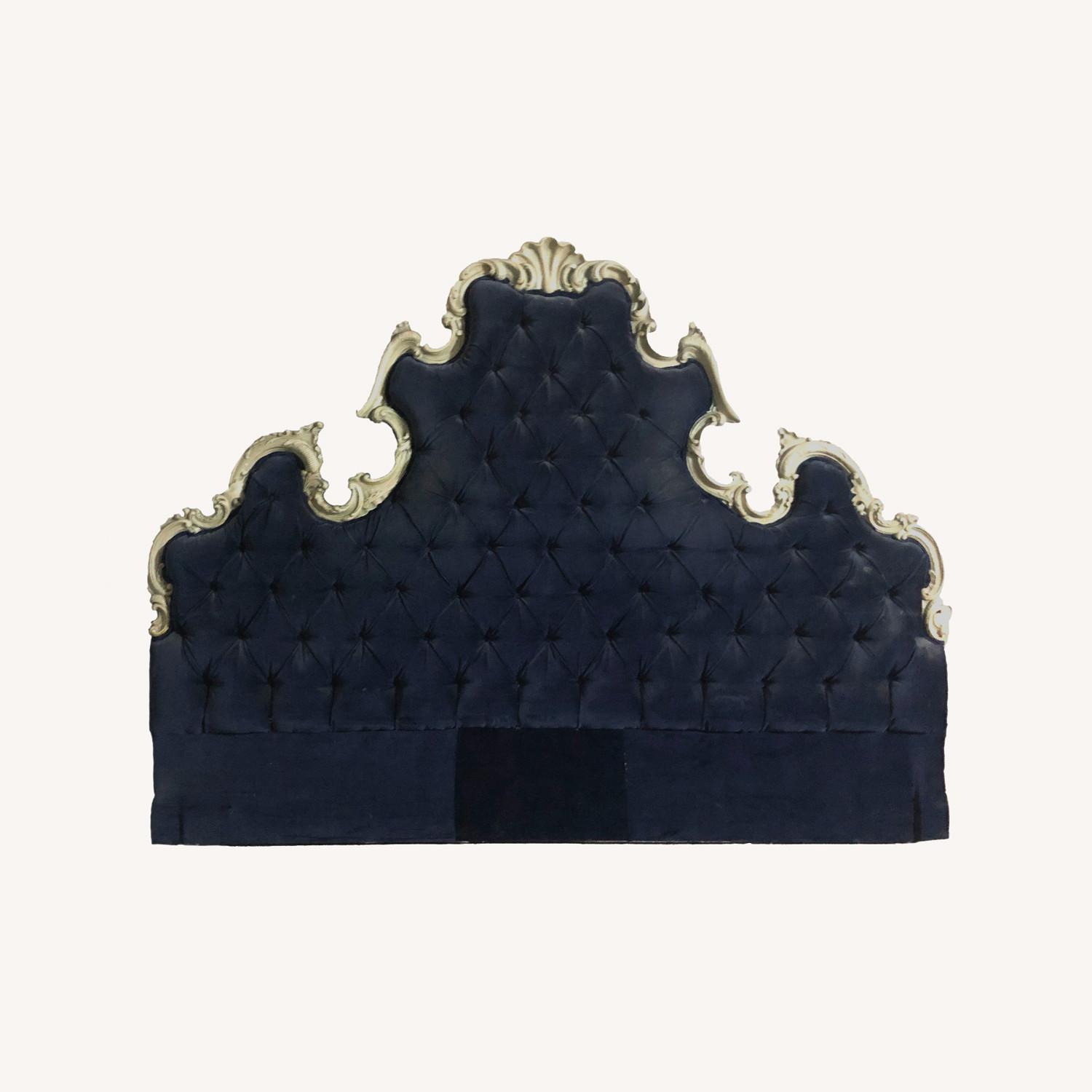 Seller's Notes:This ornate blue velvet headboard has been in our house since the 1980s. Its tallest height measures 60", next level's height measures 40". The carved wood is in remarkably good condition. The velvet is dusty and needs to be vacuumed. ~ Open to offers from interested buyers