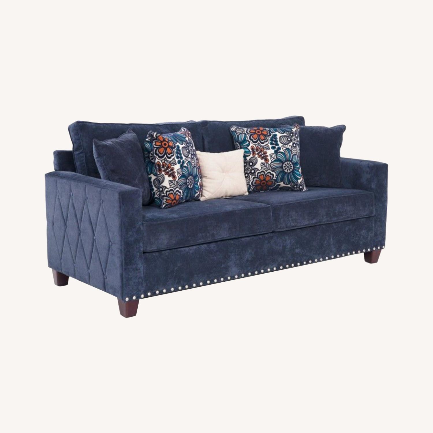 Seller's Notes:Gorgeous velvet blue sleepers sofa with matching ottoman. Couch opens up into a queen sized bed and ottoman opens up with storage space. Dimensions: Sofa: 33'' H X 86'' W X 37'' D Ottoman: 19'' H X 38.5'' W X 26'' D