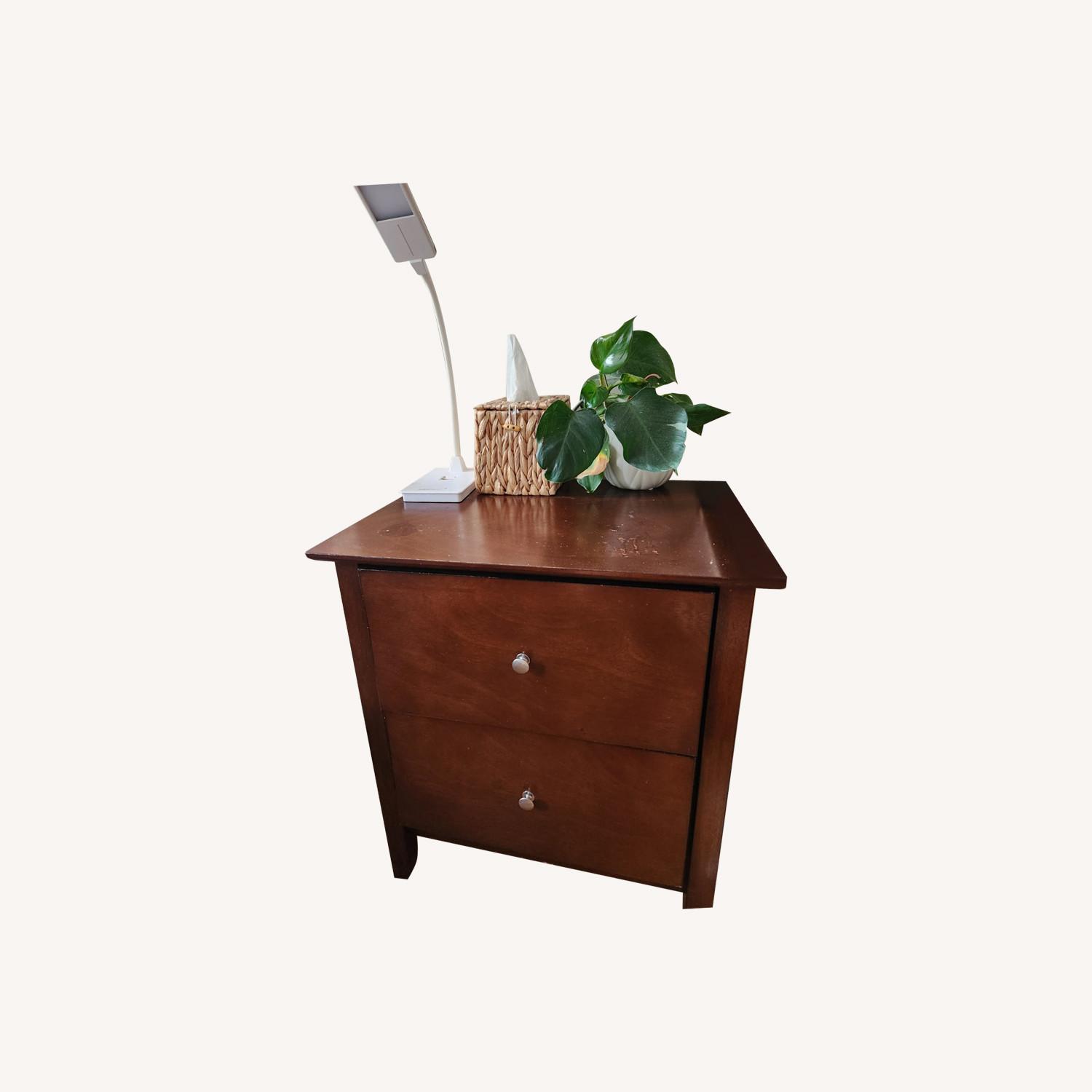 Seller's Notes:Sturdy two-drawer nightstand from Bob’s Discount Furniture. It has some light surface wear from use but still functions well—drawers open smoothly and offer great bedside storage. Matches the dresser I’m also selling, but available on its own too. Neutral dark wood tone that works with most styles. Perfect for a bedroom or guest room!