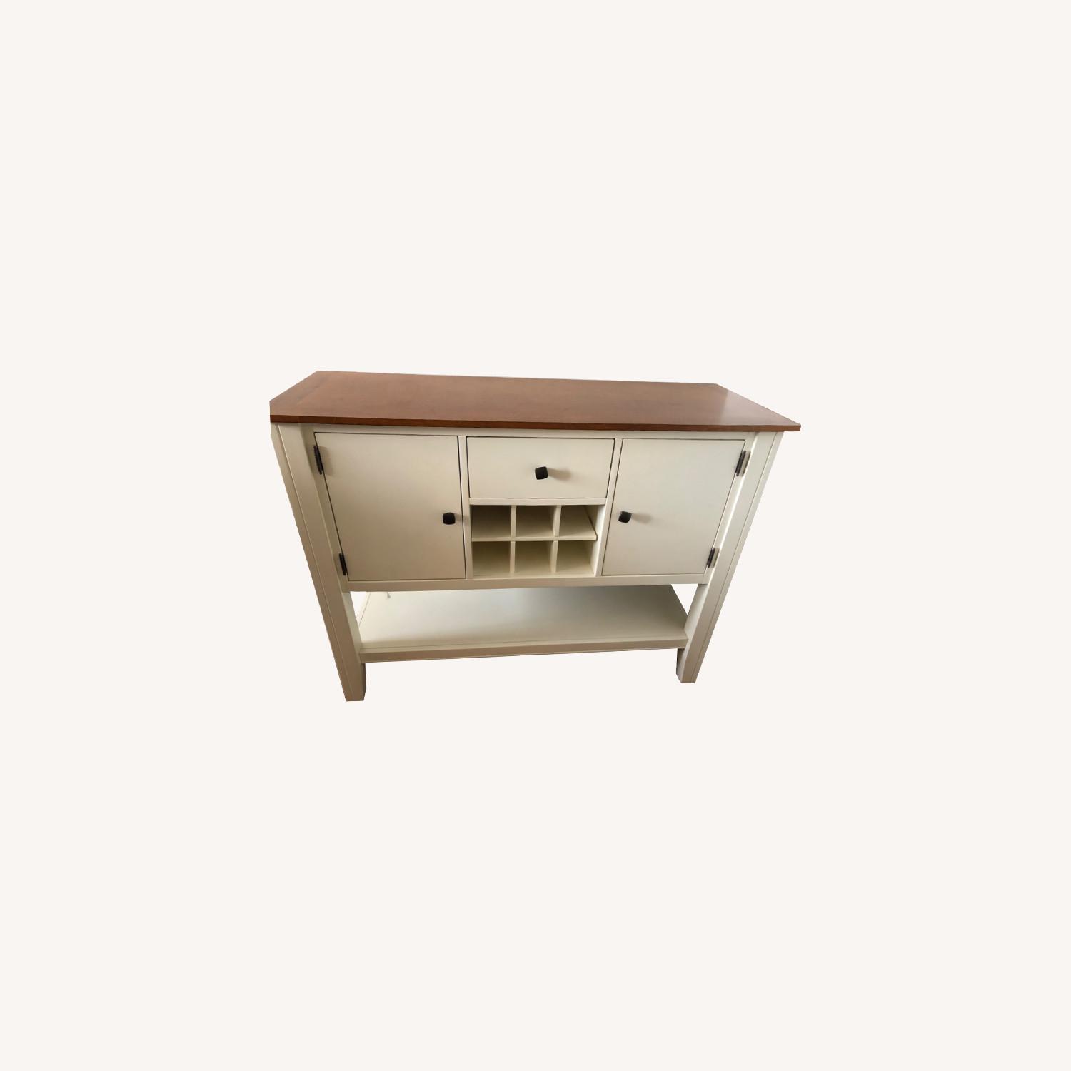 Seller's Notes:This is a buffet server bought directly from Bob’s Discount Furniture. It was bought brand new about 3 years ago but unfortunately I just moved and it does not fit in my new apartment. I am looking to sell it and will give an even better deal if the buyer is interested in buying with the matching table and chairs I have listed! Would love to sell as an entire set so if interested in ALL pieces I will cover the delivery cost. See pictures for detail there is very minimal wear. The link to Bob’s shows the same server, the only difference is that the counter top is a lighter wood color than what is pictured. The base of the server and the knobs are the color pictured. The wine rack fits 6 bottles. The original hardware to attach the buffet server to the wall is unopened and will come with the server in a small baggie in the back (see picture). This piece is from the Blake collection at Bob’s.