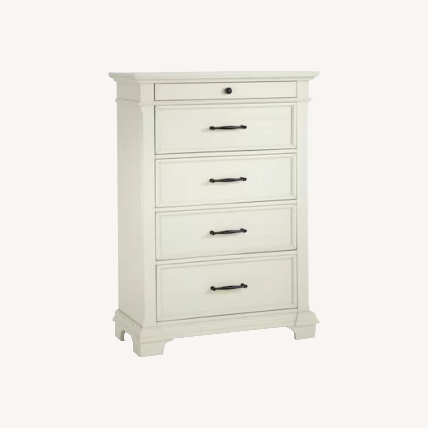 Seller's Notes:Embrace the tranquility of a cottage-inspired haven by introducing the Charleston Chest to your bedroom. This piece promises to transform your space into a relaxing retreat, seamlessly blending style and practicality. The wood finish of the Charleston Chest is beautifully complemented by the stylish black metal hardware, creating a visually striking focal point in your bedroom. The slim top drawer, lined with luxurious felt, becomes an inviting sanctuary for your favorite accessories, ensuring they are not only stored but also protected with care. For those in search of ample storage, the Charleston Chest delivers with four additional drawers. Each drawer provides the space and protection needed for the rest of your wardrobe essentials, offering a perfect balance between functionality and aesthetics. The value of this piece lies not only in its design but also in its capacity to enhance the organization of your space. Elevate your bedroom into a serene cottage retreat with the Charleston Chest. Immerse yourself in the soothing atmosphere created by its thoughtful design and experience the convenience of a well-organized and stylish sanctuary. Transform your bedroom into a space that exudes comfort and charm, where every detail contributes to the allure of your personal haven.