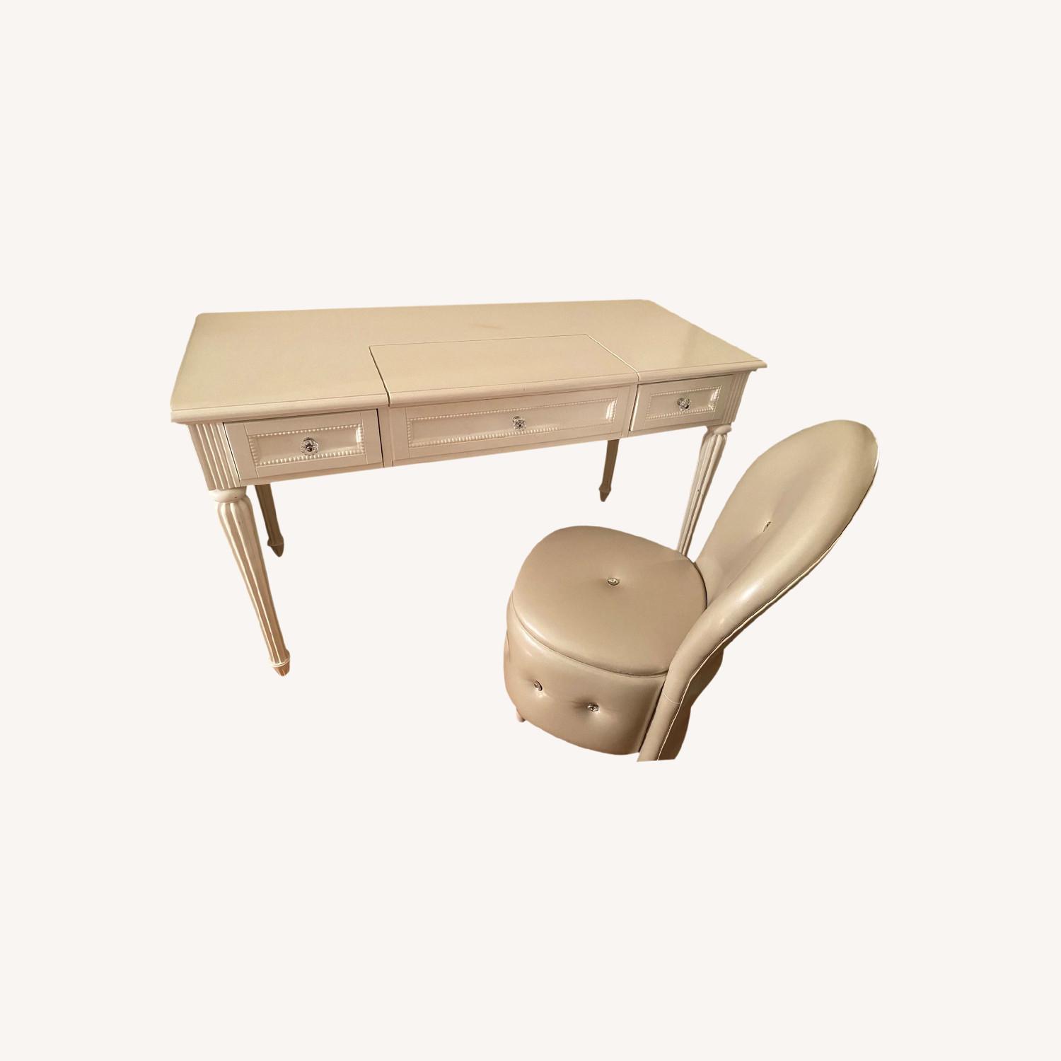 Seller's Notes:This desk and chair is a part of my teenage daugther's Madelyn bedroom set. She had it for 3 years and it's well in-tact and fully functional. There is a slight light brown make-up stain on the very top of the counter. The desk has two small drawers on either side and an opening in the middle that lifts up to reveal a mirror and space for make-up or small supplies. The chair is super soft and has a spacious storage space under the seat cover that can store books and school papers. Very cute piece!