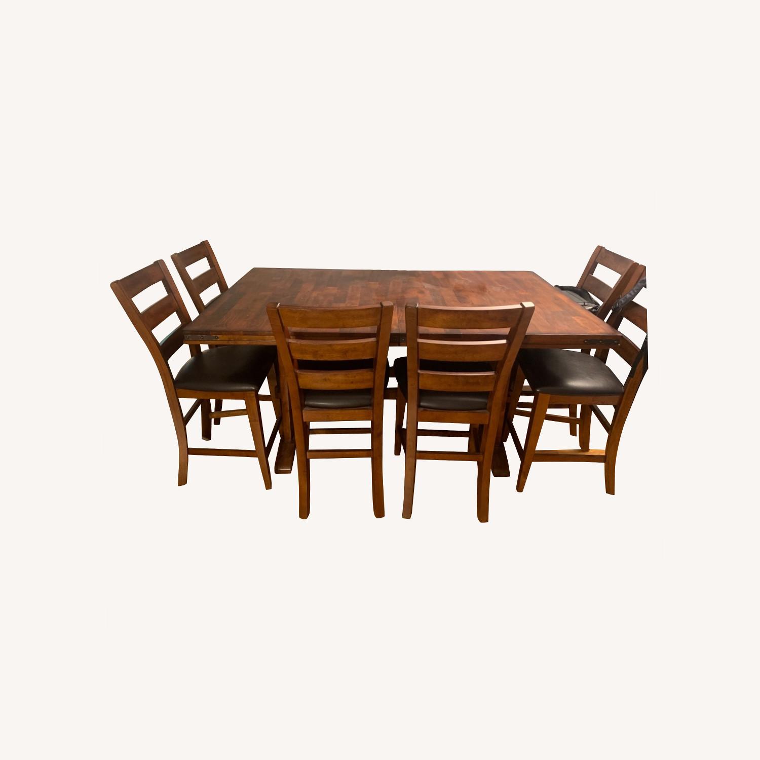 Seller's Notes:Dark brown hard wood table, extends from 72inches to 90inches or 108inches, comes with two 1.5 ft spacers to extend length of table, as well as 6 chairs, has a stain on one side of table about 4inches wide as seen in photos, otherwise it’s in excellent condition, owned for a year