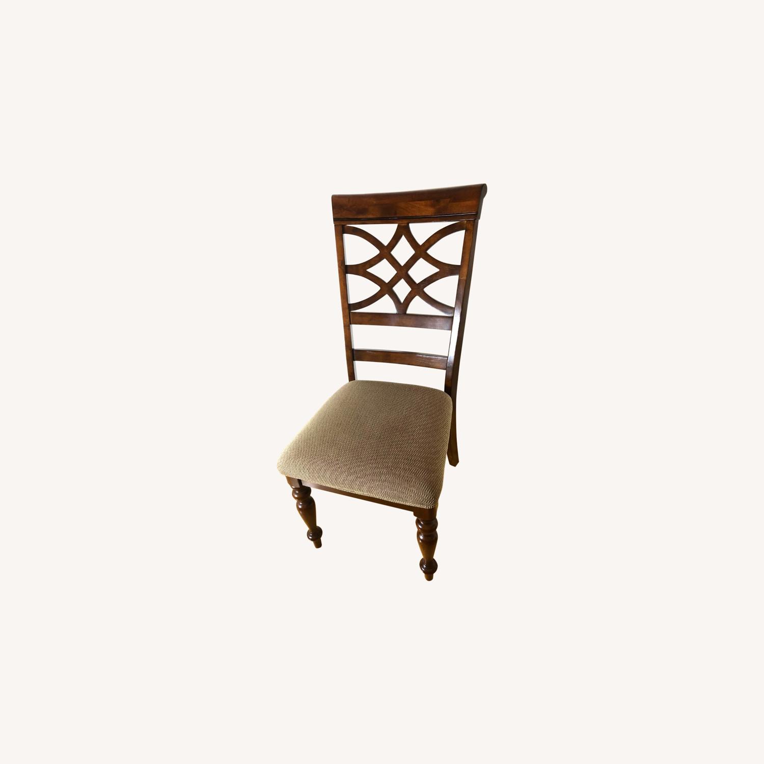 Seller's Notes:This solid wood dining chair from Bob's Discount Furniture has a charming sturdy lattice pattern across the back, and comfortable upholstered seat. I bought it for a desk chair because I wanted my chair to match the dark wood and old-fashioned aesthetic of my desk. Not only does it bring an antique-style flair to the space, it is very durable and has a wide seat (which keeps the chair from wobbling if you fidget!).