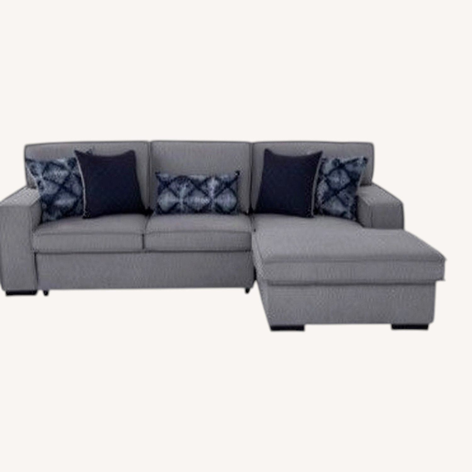 Seller's Notes:Gray fabric sectional sleeper sofa with a chaise lounge. Includes matching pillows