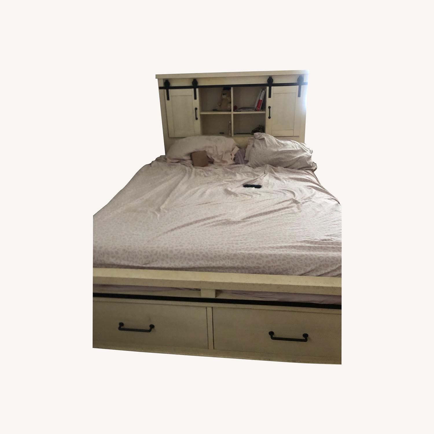 Bed includes: headboard, footboard, 2 woodside rails and storage drawers.
