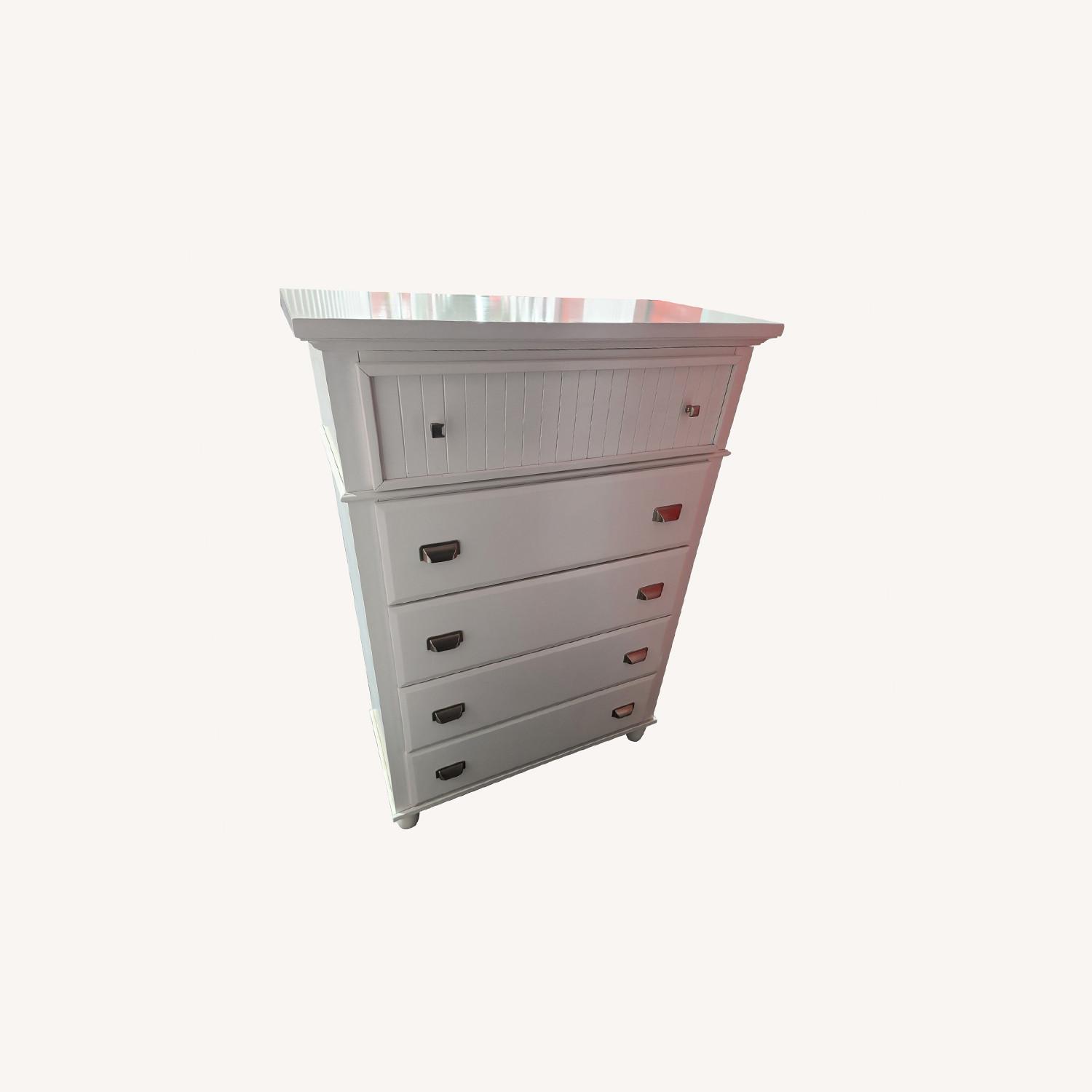 Seller's Notes:Product Specifications Product Name- Spencer White Lift-Top Chest Overall Dimension- 36"W x 17"D x 52"H Finish- White Weight- 134.0 lbs Primary Material- Wood Material- Hardwood Solids, MDF, Plywood, Poplar Solids Features- Dovetail Joints, Drawer Glides, Felt Lined Drawers, Lift Top Number of Drawers- 5 Dimensions- 27.5'' x 13.5'' x 3.5'' 27.75'' x 13'' x 5''