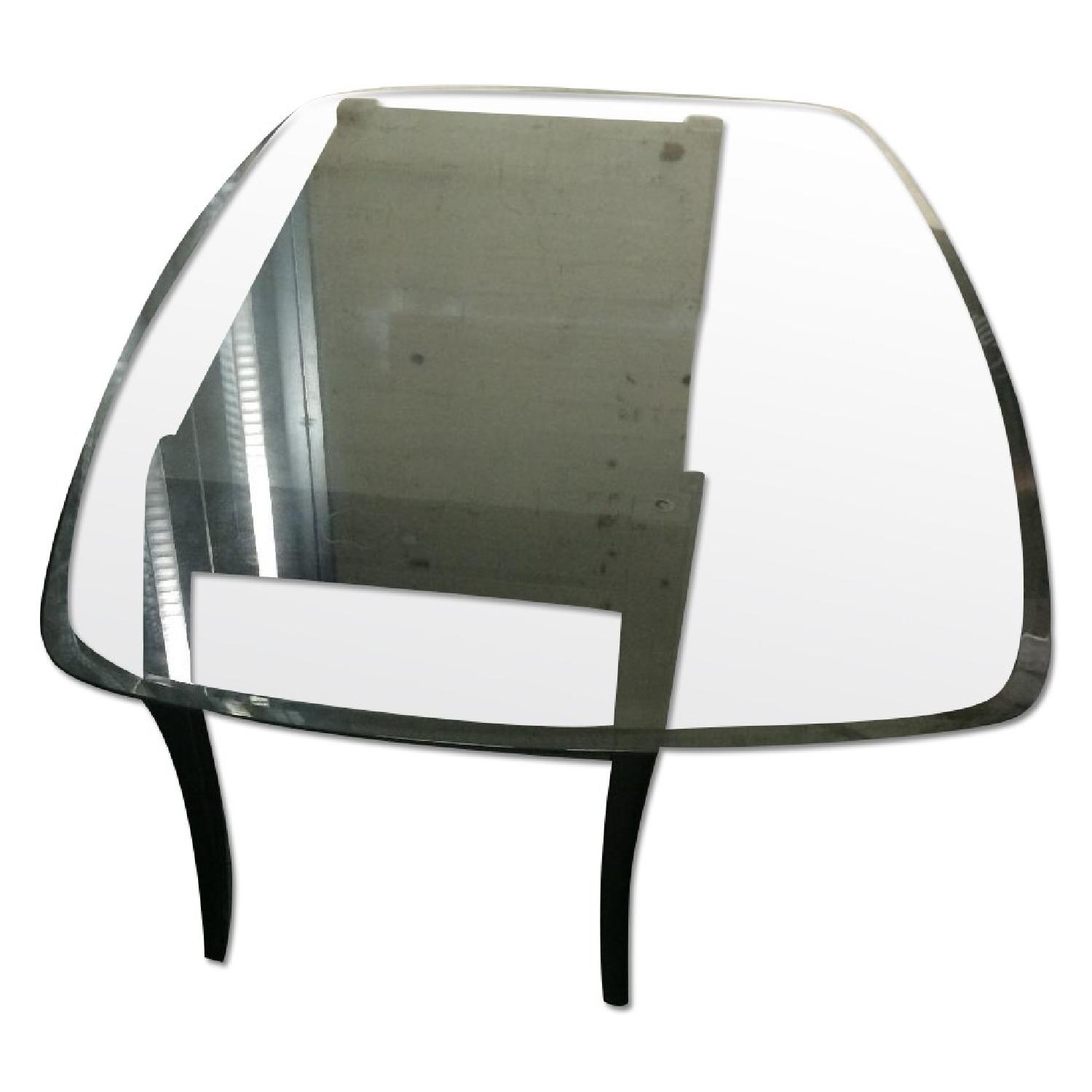 Seller's Notes:Beautiful glass dining table with dark wood stained base/legs (4). Can fit 4-6 chairs comfortably. Very lightly used--mint condition! The